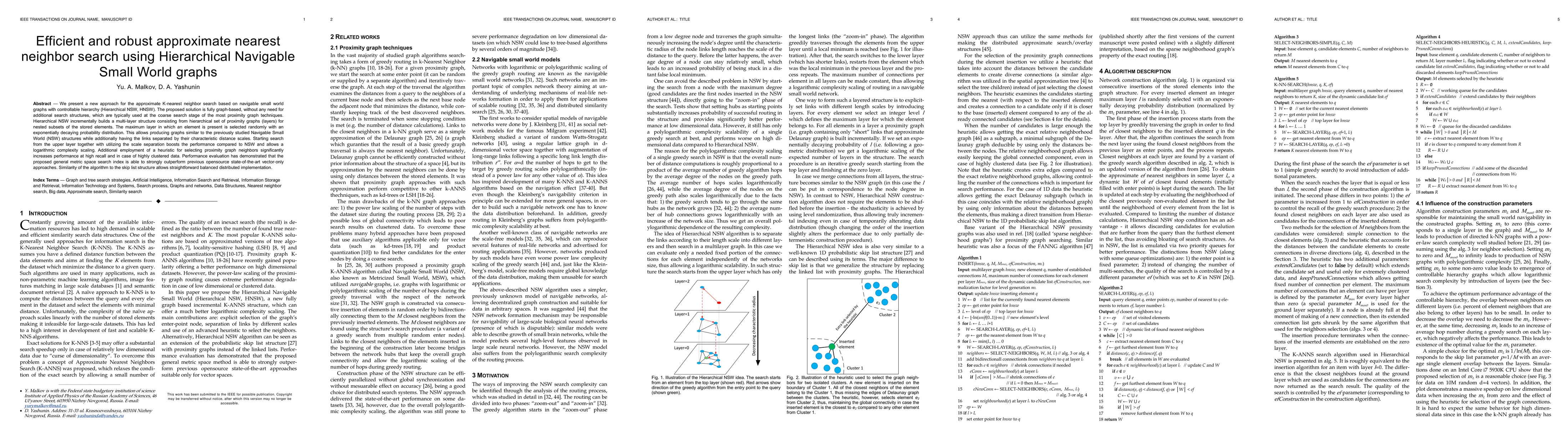 The research presents a new approach for approximate K-nearest neighbor search using Hierarchical Navigable Small World graphs (HNSW). This method incrementally builds a multi-layer structure without additional search structures, utilizing a graph-based solution with controllable hierarchy.
