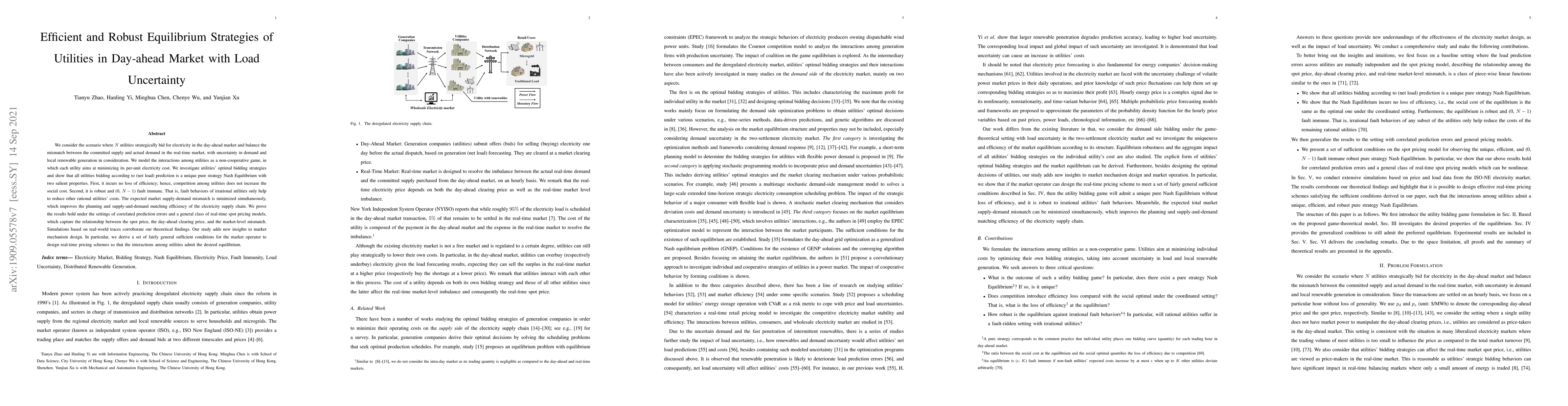 This paper models utilities' bidding strategies in a day-ahead electricity market with demand and renewable generation uncertainty as a non-cooperative game. It finds that a unique Nash Equilibrium exists where all utilities bid based on net load predictions, ensuring no efficiency loss and robustness against irrational competitors, while minimizing supply-demand mismatch.