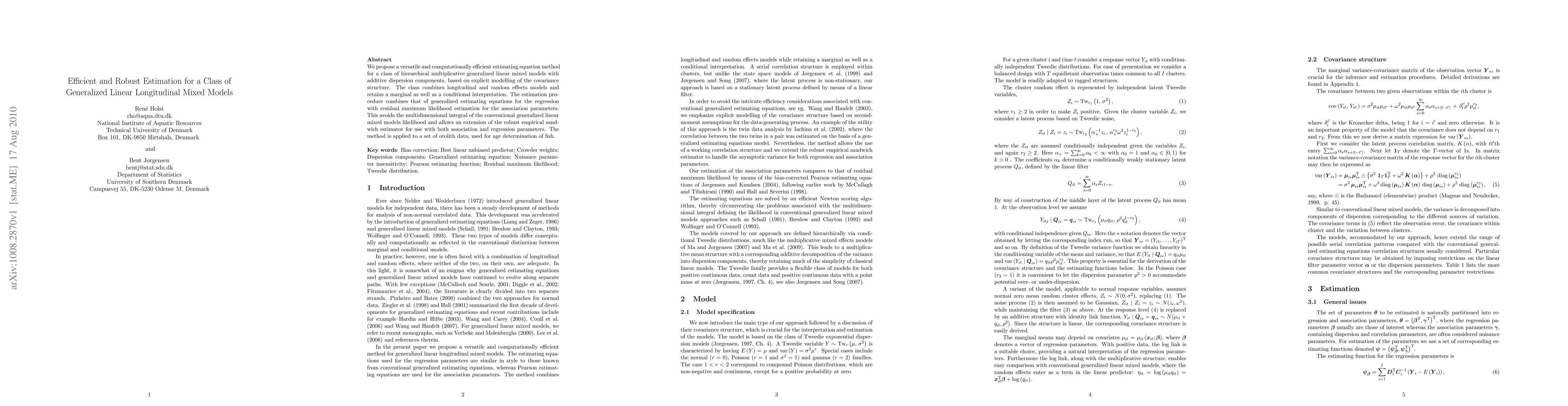We propose a versatile and computationally efficient estimating equation method for a class of hierarchical multiplicative generalized linear mixed models with additive dispersion components, based on explicit modelling of the covariance structure. The class combines longitudinal and random effects models and retains a marginal as well as a conditional interpretation. The estimation procedure combines that of generalized estimating equations for the regression with residual maximum likelihood estimation for the association parameters. This avoids the multidimensional integral of the conventional generalized linear mixed models likelihood and allows an extension of the robust empirical sandwich estimator for use with both association and regression parameters. The method is applied to a set of otolith data, used for age determination of fish.