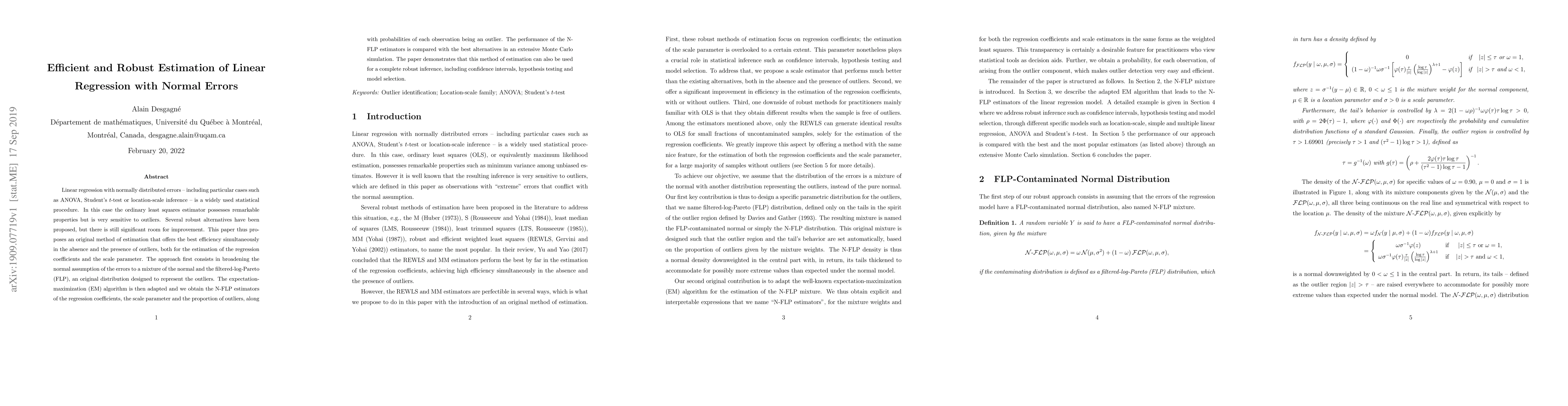 Linear regression with normally distributed errors - including particular cases such as ANOVA, Student's t-test or location-scale inference - is a widely used statistical procedure. In this case the ordinary least squares estimator possesses remarkable properties but is very sensitive to outliers. Several robust alternatives have been proposed, but there is still significant room for improvement. This paper thus proposes an original method of estimation that offers the best efficiency simultaneously in the absence and the presence of outliers, both for the estimation of the regression coefficients and the scale parameter. The approach first consists in broadening the normal assumption of the errors to a mixture of the normal and the filtered-log-Pareto (FLP), an original distribution designed to represent the outliers. The expectation-maximization (EM) algorithm is then adapted and we obtain the N-FLP estimators of the regression coefficients, the scale parameter and the proportion of outliers, along with probabilities of each observation being an outlier. The performance of the N-FLP estimators is compared with the best alternatives in an extensive Monte Carlo simulation. The paper demonstrates that this method of estimation can also be used for a complete robust inference, including confidence intervals, hypothesis testing and model selection.