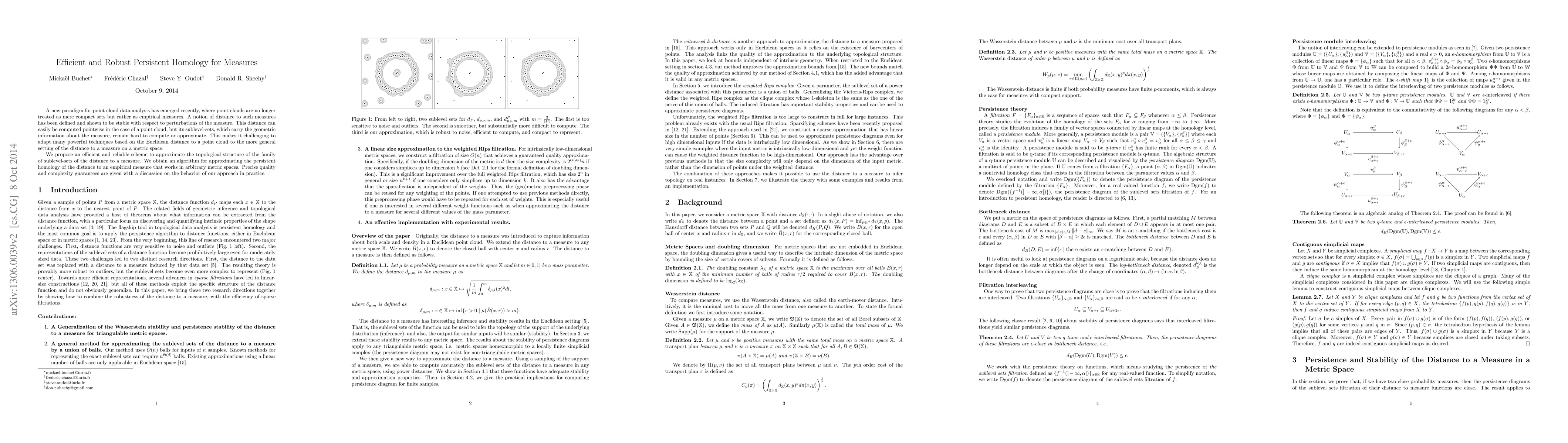 We extend the notion of the distance to a measure from Euclidean space to probability measures on general metric spaces as a way to do topological data analysis in a way that is robust to noise and outliers. We then give an efficient way to approximate the sub-level sets of this function by a union of metric balls and extend previous results on sparse Rips filtrations to this setting. This robust and efficient approach to topological data analysis is illustrated with several examples from an implementation.