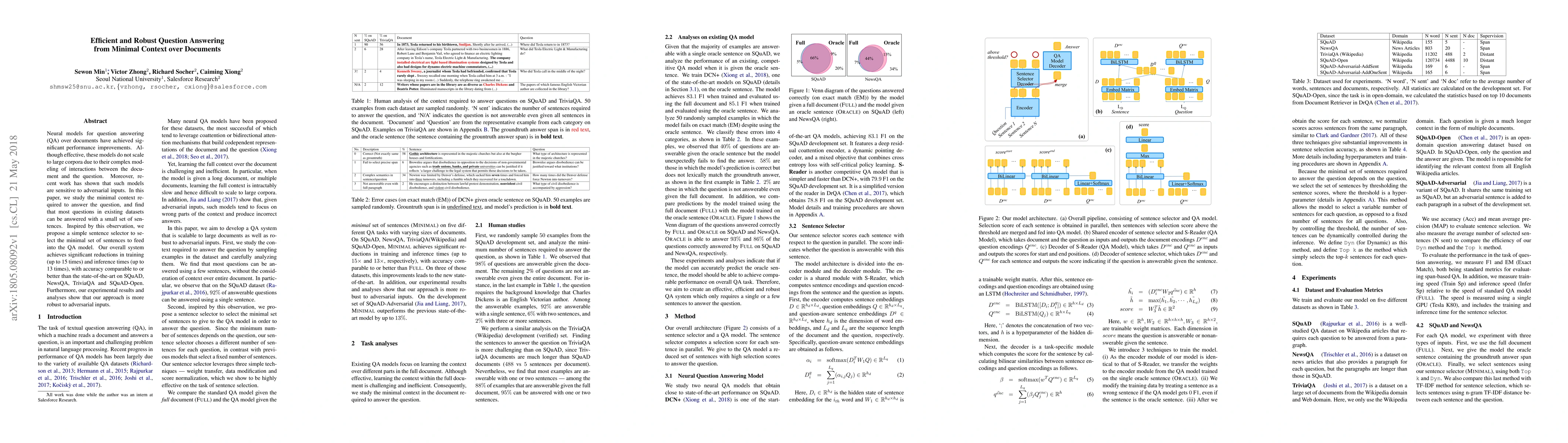 Neural models for question answering (QA) over documents have achieved significant performance improvements. Although effective, these models do not scale to large corpora due to their complex modeling of interactions between the document and the question. Moreover, recent work has shown that such models are sensitive to adversarial inputs. In this paper, we study the minimal context required to answer the question, and find that most questions in existing datasets can be answered with a small set of sentences. Inspired by this observation, we propose a simple sentence selector to select the minimal set of sentences to feed into the QA model. Our overall system achieves significant reductions in training (up to 15 times) and inference times (up to 13 times), with accuracy comparable to or better than the state-of-the-art on SQuAD, NewsQA, TriviaQA and SQuAD-Open. Furthermore, our experimental results and analyses show that our approach is more robust to adversarial inputs.