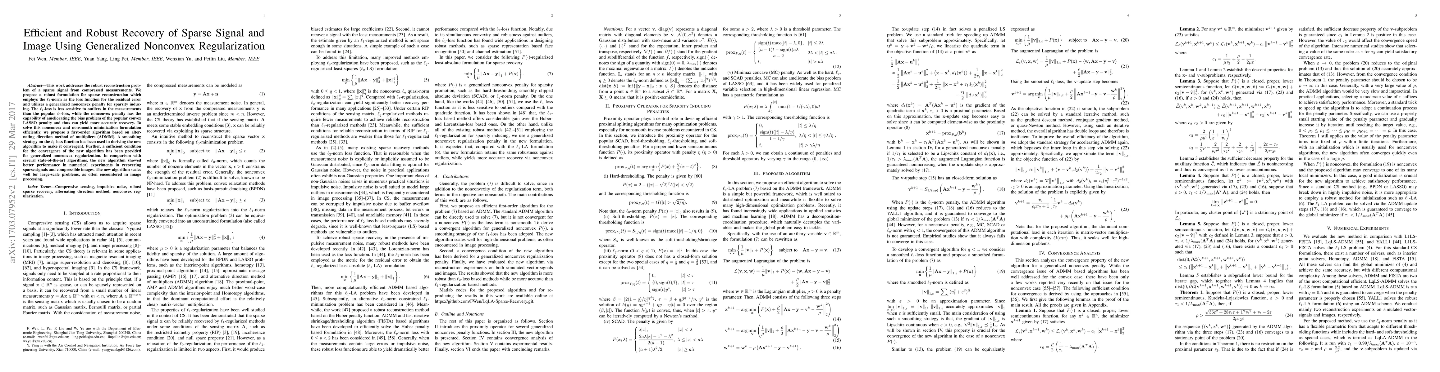 This work addresses the robust reconstruction problem of a sparse signal from compressed measurements. We propose a robust formulation for sparse reconstruction which employs the $\ell_1$-norm as the loss function for the residual error and utilizes a generalized nonconvex penalty for sparsity inducing. The $\ell_1$-loss is less sensitive to outliers in the measurements than the popular $\ell_2$-loss, while the nonconvex penalty has the capability of ameliorating the bias problem of the popular convex LASSO penalty and thus can yield more accurate recovery. To solve this nonconvex and nonsmooth minimization formulation efficiently, we propose a first-order algorithm based on alternating direction method of multipliers (ADMM). A smoothing strategy on the $\ell_1$-loss function has been used in deriving the new algorithm to make it convergent. Further, a sufficient condition for the convergence of the new algorithm has been provided for generalized nonconvex regularization. In comparison with several state-of-the-art algorithms, the new algorithm showed better performance in numerical experiments in recovering sparse signals and compressible images. The new algorithm scales well for large-scale problems, as often encountered in image processing.