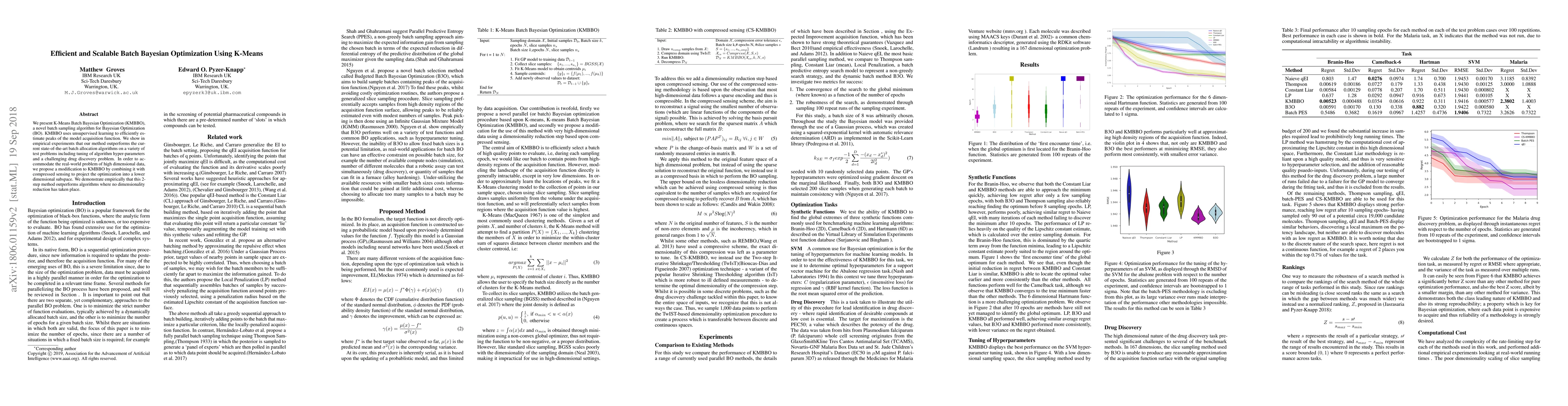 A new algorithm called K-Means Batch Bayesian Optimization (KMBBO) improves on existing batch allocation algorithms for Bayesian Optimization by using unsupervised learning to efficiently estimate peaks of the model acquisition function.
