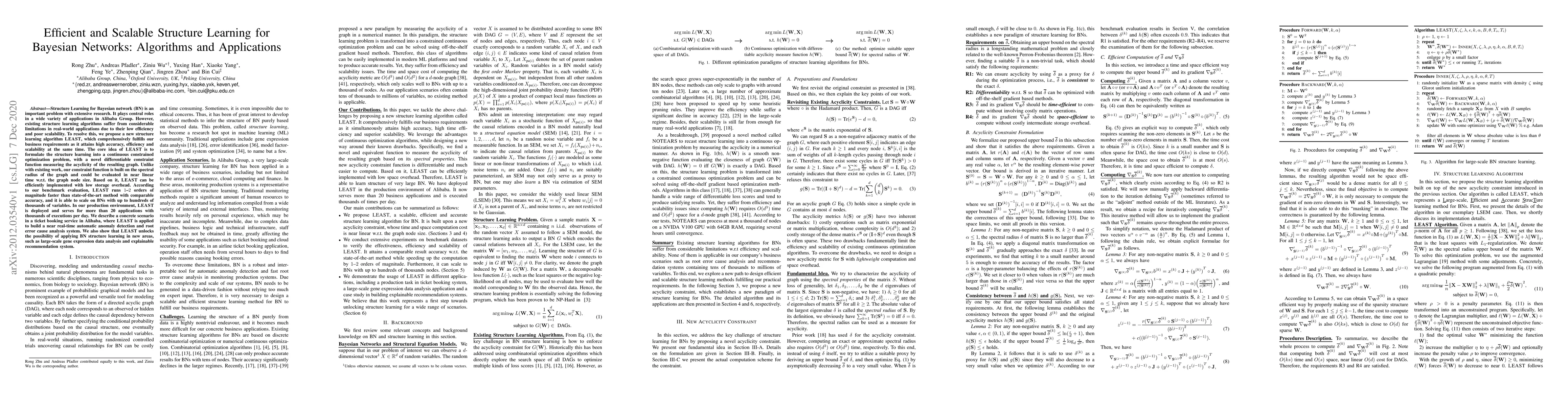 Structure Learning for Bayesian network (BN) is an important problem with extensive research. It plays central roles in a wide variety of applications in Alibaba Group. However, existing structure learning algorithms suffer from considerable limitations in real world applications due to their low efficiency and poor scalability. To resolve this, we propose a new structure learning algorithm LEAST, which comprehensively fulfills our business requirements as it attains high accuracy, efficiency and scalability at the same time. The core idea of LEAST is to formulate the structure learning into a continuous constrained optimization problem, with a novel differentiable constraint function measuring the acyclicity of the resulting graph. Unlike with existing work, our constraint function is built on the spectral radius of the graph and could be evaluated in near linear time w.r.t. the graph node size. Based on it, LEAST can be efficiently implemented with low storage overhead. According to our benchmark evaluation, LEAST runs 1 to 2 orders of magnitude faster than state of the art method with comparable accuracy, and it is able to scale on BNs with up to hundreds of thousands of variables. In our production environment, LEAST is deployed and serves for more than 20 applications with thousands of executions per day. We describe a concrete scenario in a ticket booking service in Alibaba, where LEAST is applied to build a near real-time automatic anomaly detection and root error cause analysis system. We also show that LEAST unlocks the possibility of applying BN structure learning in new areas, such as large-scale gene expression data analysis and explainable recommendation system.