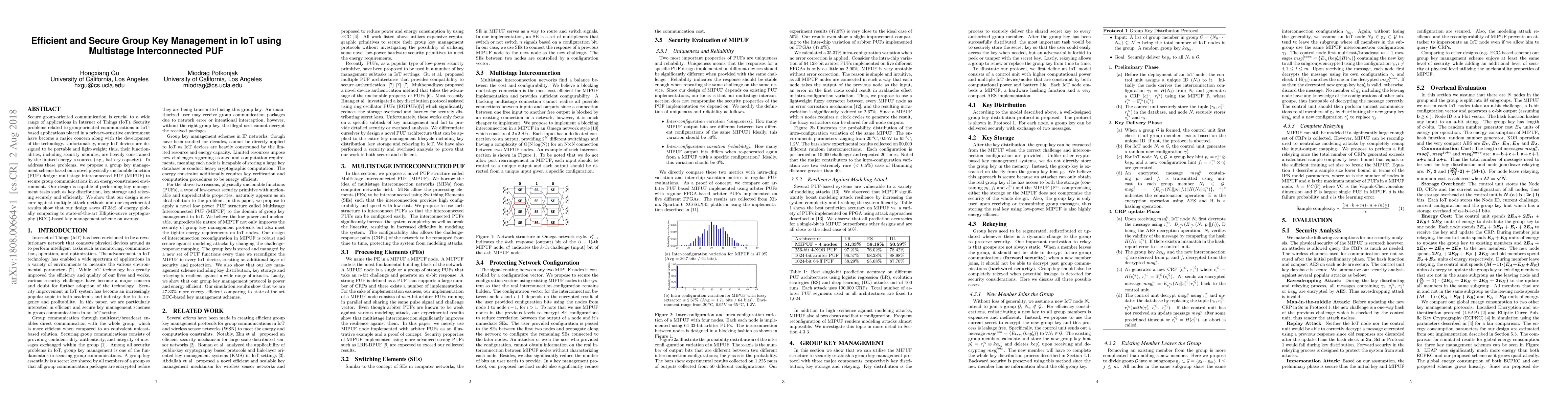 This paper proposes a secure group key management scheme using a multistage interconnected physically unclonable function (MIPUF) to address the security and energy constraints in IoT environments. The MIPUF design efficiently handles key distribution, storage, and rekeying while saving 47.33% energy compared to ECC-based schemes on average.