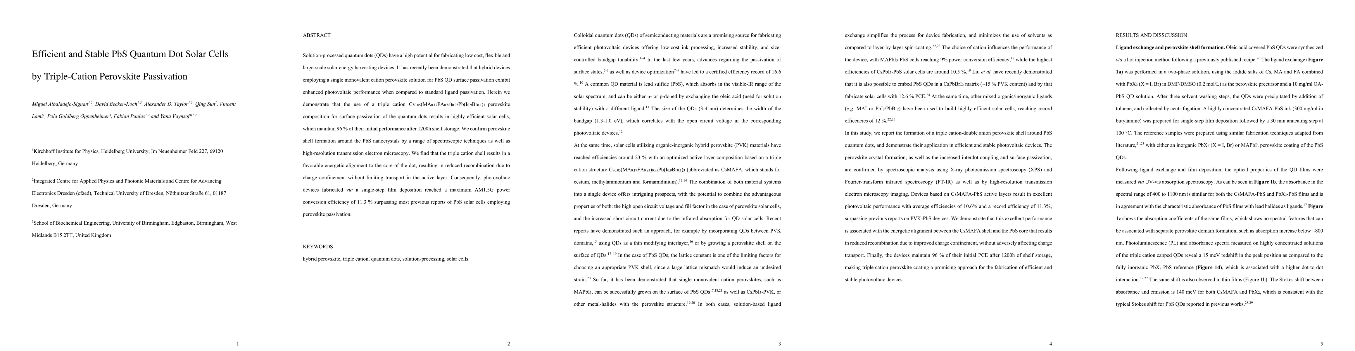 This paper demonstrates that PbS quantum dot solar cells passivated with a triple-cation perovskite (Cs0.05(MA0.17FA0.83)0.95Pb(I0.9Br0.1)3) achieve a high efficiency of 11.3% and maintain 96% of their initial performance after 1200h of storage, due to reduced recombination and favorable energetic alignment.