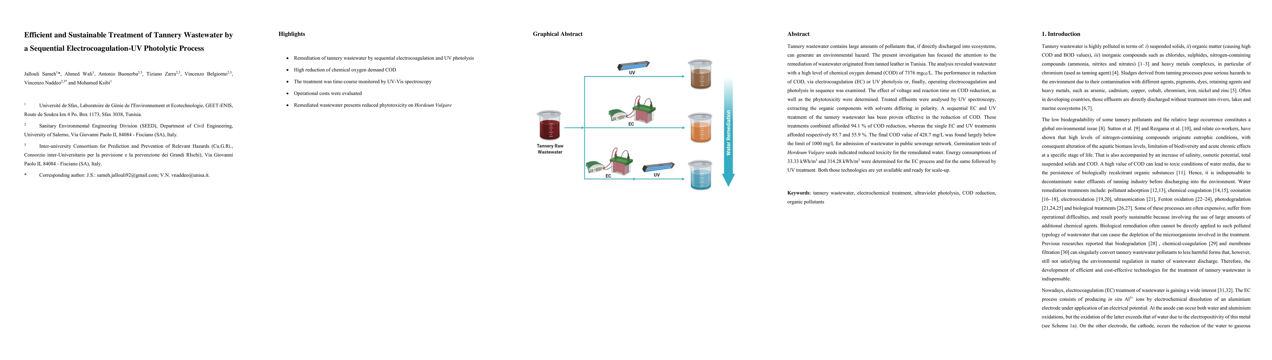 This study investigates the efficient treatment of high-pollutant tannery wastewater from Tunisia using a sequential electrocoagulation-UV photolytic process, achieving a 94.1% reduction in chemical oxygen demand (COD) and significantly reducing phytotoxicity, making the treated water suitable for sewer discharge.