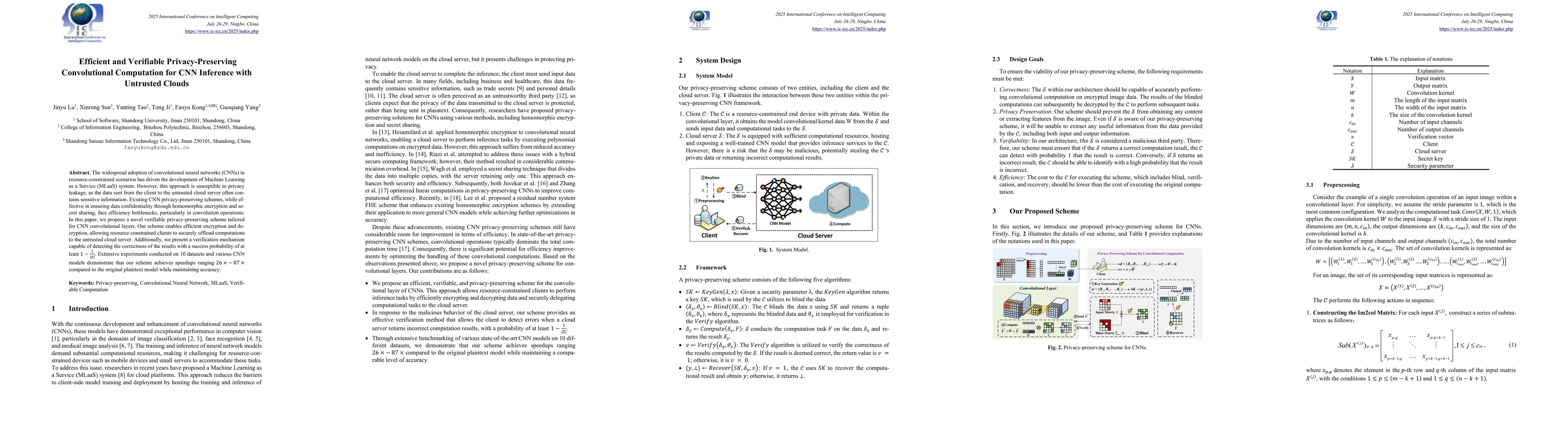 The widespread adoption of convolutional neural networks (CNNs) in resource-constrained scenarios has driven the development of Machine Learning as a Service (MLaaS) system. However, this approach is susceptible to privacy leakage, as the data sent from the client to the untrusted cloud server often contains sensitive information. Existing CNN privacy-preserving schemes, while effective in ensuring data confidentiality through homomorphic encryption and secret sharing, face efficiency bottlenecks, particularly in convolution operations. In this paper, we propose a novel verifiable privacy-preserving scheme tailored for CNN convolutional layers. Our scheme enables efficient encryption and decryption, allowing resource-constrained clients to securely offload computations to the untrusted cloud server. Additionally, we present a verification mechanism capable of detecting the correctness of the results with a success probability of at least $1-\frac{1}{\left|Z\right|}$. Extensive experiments conducted on 10 datasets and various CNN models demonstrate that our scheme achieves speedups ranging $26 \times$ ~ $\ 87\times$ compared to the original plaintext model while maintaining accuracy.