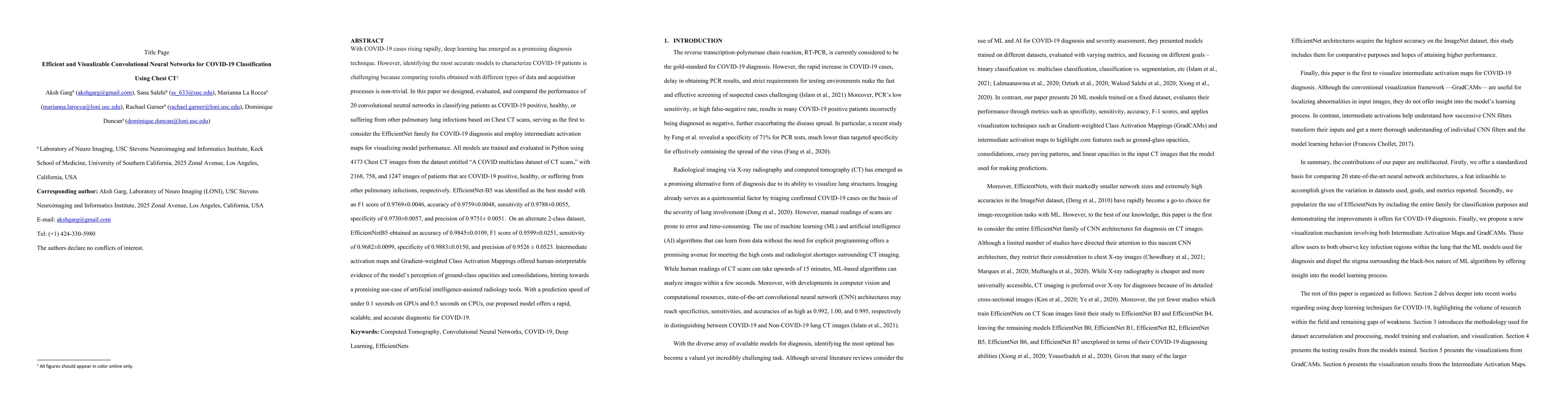With COVID-19 cases rising rapidly, deep learning has emerged as a promising diagnosis technique. However, identifying the most accurate models to characterize COVID-19 patients is challenging because comparing results obtained with different types of data and acquisition processes is non-trivial. In this paper we designed, evaluated, and compared the performance of 20 convolutional neutral networks in classifying patients as COVID-19 positive, healthy, or suffering from other pulmonary lung infections based on Chest CT scans, serving as the first to consider the EfficientNet family for COVID-19 diagnosis and employ intermediate activation maps for visualizing model performance. All models are trained and evaluated in Python using 4173 Chest CT images from the dataset entitled "A COVID multiclass dataset of CT scans," with 2168, 758, and 1247 images of patients that are COVID-19 positive, healthy, or suffering from other pulmonary infections, respectively. EfficientNet-B5 was identified as the best model with an F1 score of 0.9769+/-0.0046, accuracy of 0.9759+/-0.0048, sensitivity of 0.9788+/-0.0055, specificity of 0.9730+/-0.0057, and precision of 0.9751 +/- 0.0051. On an alternate 2-class dataset, EfficientNetB5 obtained an accuracy of 0.9845+/-0.0109, F1 score of 0.9599+/-0.0251, sensitivity of 0.9682+/-0.0099, specificity of 0.9883+/-0.0150, and precision of 0.9526 +/- 0.0523. Intermediate activation maps and Gradient-weighted Class Activation Mappings offered human-interpretable evidence of the model's perception of ground-class opacities and consolidations, hinting towards a promising use-case of artificial intelligence-assisted radiology tools. With a prediction speed of under 0.1 seconds on GPUs and 0.5 seconds on CPUs, our proposed model offers a rapid, scalable, and accurate diagnostic for COVID-19.