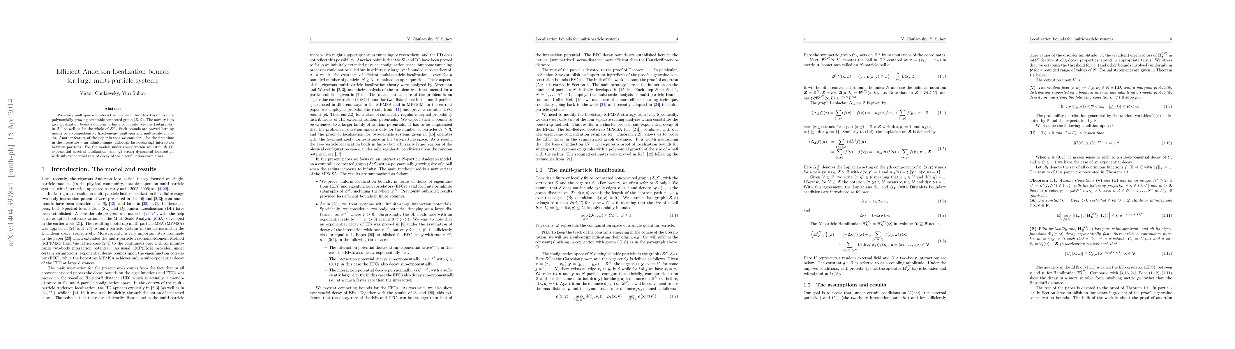We study multi-particle interactive quantum disordered systems on a polynomially-growing countable connected graph (Z,E). The novelty is to give localization bounds uniform in finite or infinite volumes (subgraphs) in Z^N as well as for the whole of Z^N. Such bounds are proved here by means of a comprehensive fixed-energy multi-particle multi-scale analysis. Another feature of the paper is that we consider -- for the first time in the literature -- an infinite-range (although fast-decaying) interaction between particles. For the models under consideration we establish (1) exponential spectral localization, and (2) strong dynamical localization with sub-exponential rate of decay of the eigenfunction correlators.