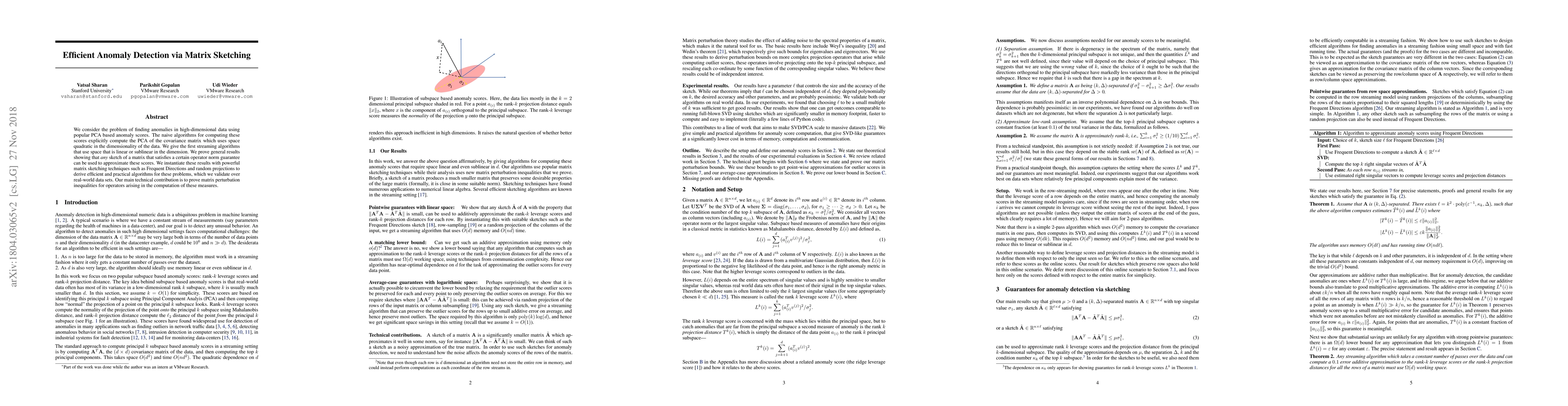 This paper presents streaming algorithms for efficient anomaly detection in high-dimensional data using PCA-based scores, employing matrix sketching techniques to reduce space complexity from quadratic to linear or sublinear. The authors prove matrix perturbation inequalities and validate their methods with real-world datasets.