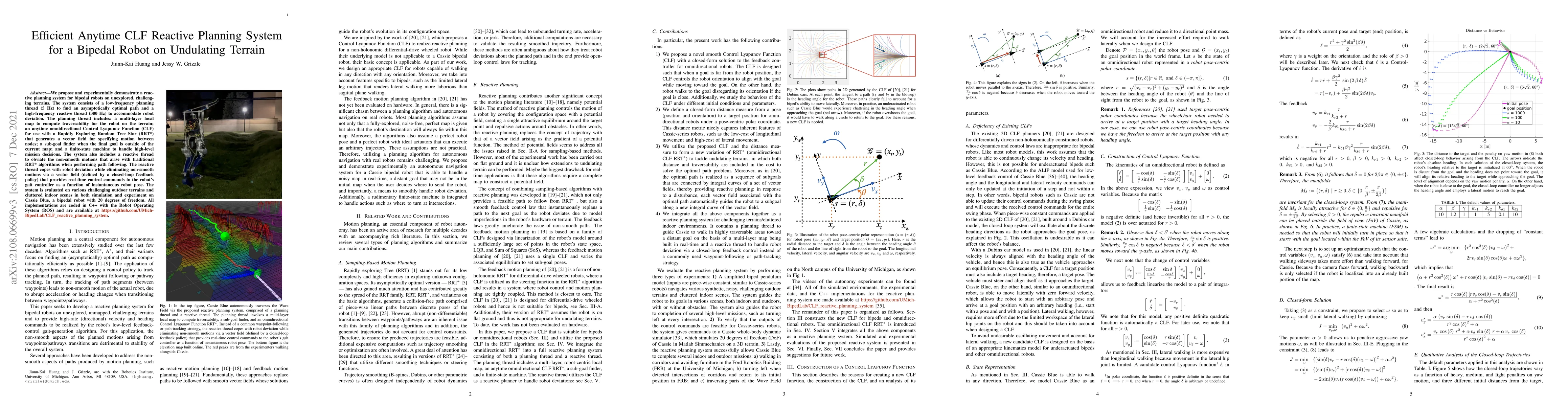 We propose and experimentally demonstrate a reactive planning system for bipedal robots on unexplored, challenging terrains. The system consists of a low-frequency planning thread (5 Hz) to find an asymptotically optimal path and a high-frequency reactive thread (300 Hz) to accommodate robot deviation. The planning thread includes: a multi-layer local map to compute traversability for the robot on the terrain; an anytime omnidirectional Control Lyapunov Function (CLF) for use with a Rapidly Exploring Random Tree Star (RRT*) that generates a vector field for specifying motion between nodes; a sub-goal finder when the final goal is outside of the current map; and a finite-state machine to handle high-level mission decisions. The system also includes a reactive thread to obviate the non-smooth motions that arise with traditional RRT* algorithms when performing path following. The reactive thread copes with robot deviation while eliminating non-smooth motions via a vector field (defined by a closed-loop feedback policy) that provides real-time control commands to the robot's gait controller as a function of instantaneous robot pose. The system is evaluated on various challenging outdoor terrains and cluttered indoor scenes in both simulation and experiment on Cassie Blue, a bipedal robot with 20 degrees of freedom. All implementations are coded in C++ with the Robot Operating System (ROS) and are available at https://github.com/UMich-BipedLab/CLF_reactive_planning_system.