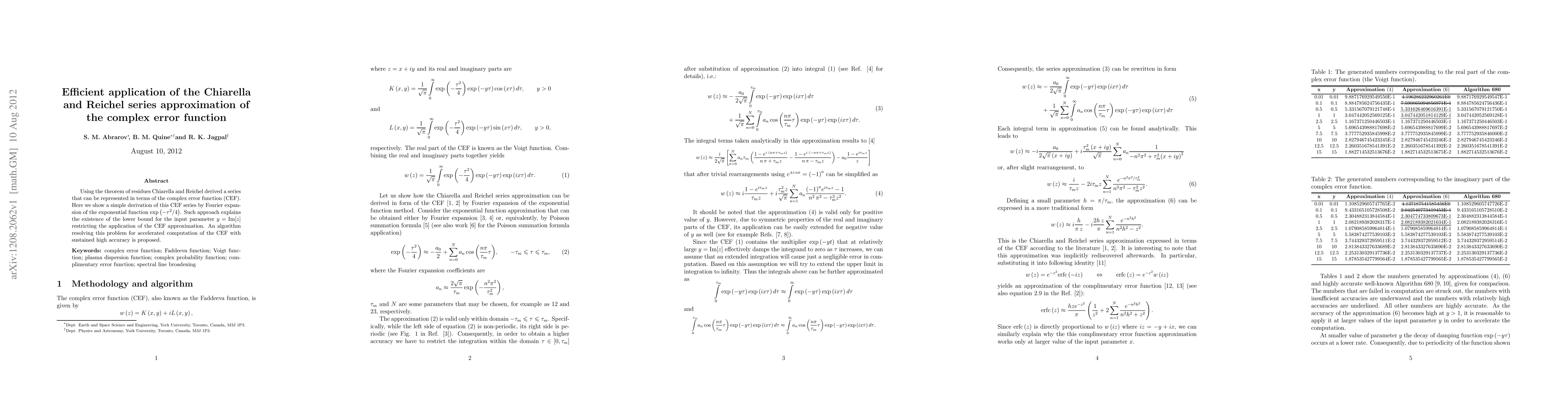 Using the theorem of residues Chiarella and Reichel derived a series that can be represented in terms of the complex error function (CEF). Here we show a simple derivation of this CEF series by Fourier expansion of the exponential function $\exp ({- {\tau ^2}/4})$. Such approach explains the existence of the lower bound for the input parameter $y = \operatorname{Im} [z]$ restricting the application of the CEF approximation. An algorithm resolving this problem for accelerated computation of the CEF with sustained high accuracy is proposed.