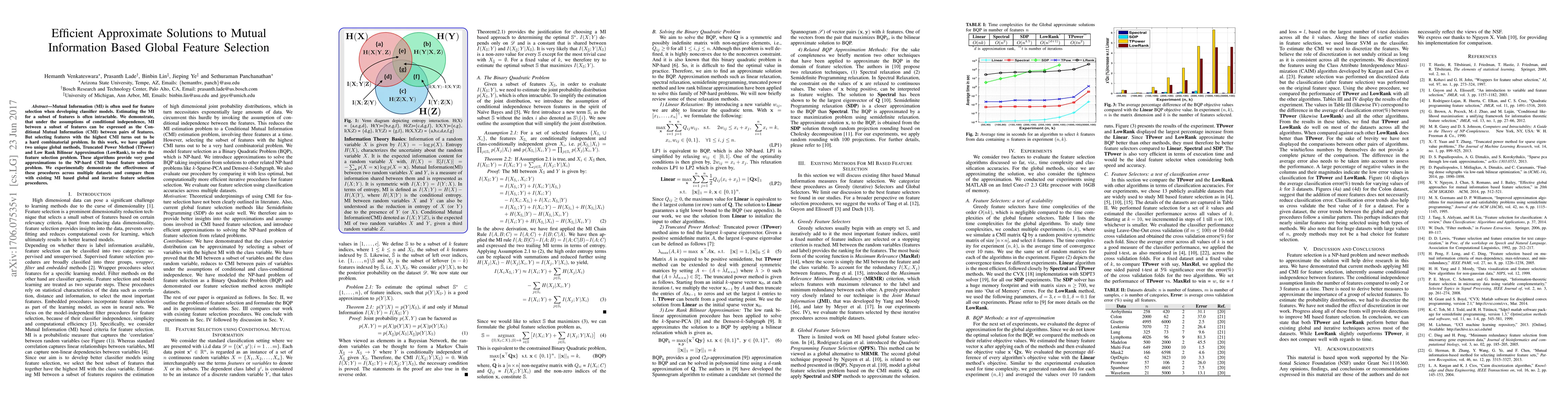 Mutual Information (MI) is often used for feature selection when developing classifier models. Estimating the MI for a subset of features is often intractable. We demonstrate, that under the assumptions of conditional independence, MI between a subset of features can be expressed as the Conditional Mutual Information (CMI) between pairs of features. But selecting features with the highest CMI turns out to be a hard combinatorial problem. In this work, we have applied two unique global methods, Truncated Power Method (TPower) and Low Rank Bilinear Approximation (LowRank), to solve the feature selection problem. These algorithms provide very good approximations to the NP-hard CMI based feature selection problem. We experimentally demonstrate the effectiveness of these procedures across multiple datasets and compare them with existing MI based global and iterative feature selection procedures.