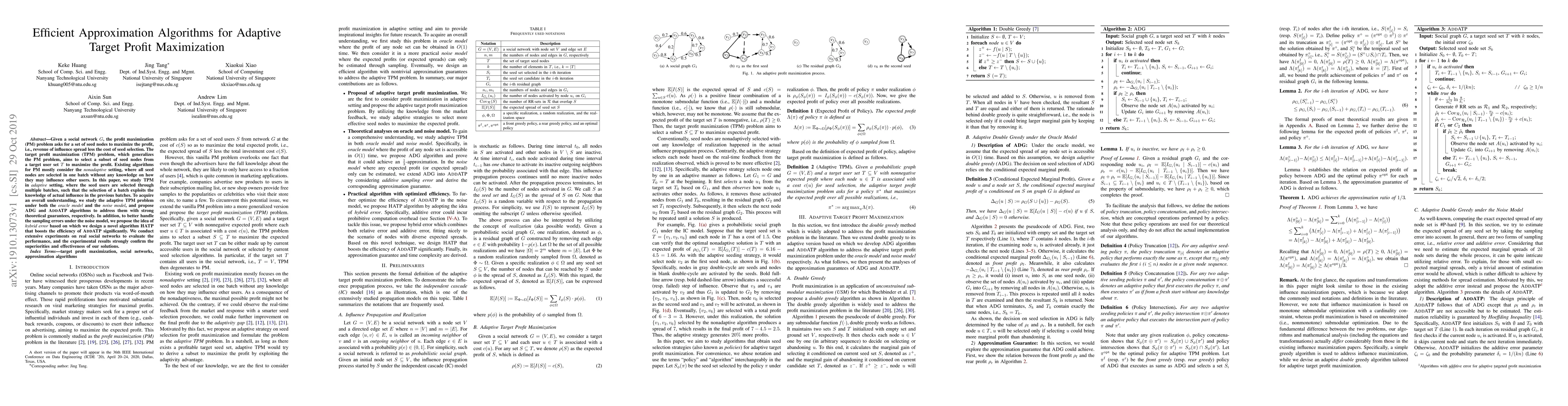 This paper proposes efficient approximation algorithms for the adaptive target profit maximization problem in social networks, where seed nodes are selected in multiple batches to maximize profit based on prior influence knowledge. It introduces algorithms ADG and AddATP under the oracle and noise models, respectively, and a hybrid error-based algorithm HATP to improve efficiency, validated through experiments on real social networks.