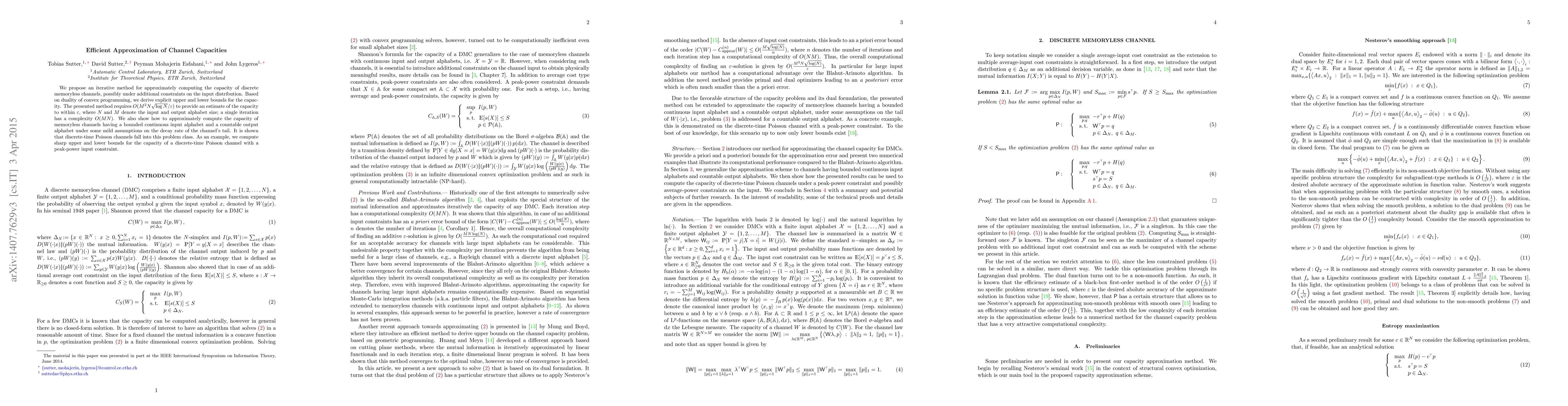 We propose an iterative method for approximately computing the capacity of discrete memoryless channels, possibly under additional constraints on the input distribution. Based on duality of convex programming, we derive explicit upper and lower bounds for the capacity. The presented method requires $O(M^2 N \sqrt{\log N}/\varepsilon)$ to provide an estimate of the capacity to within $\varepsilon$, where $N$ and $M$ denote the input and output alphabet size; a single iteration has a complexity $O(M N)$. We also show how to approximately compute the capacity of memoryless channels having a bounded continuous input alphabet and a countable output alphabet under some mild assumptions on the decay rate of the channel's tail. It is shown that discrete-time Poisson channels fall into this problem class. As an example, we compute sharp upper and lower bounds for the capacity of a discrete-time Poisson channel with a peak-power input constraint.