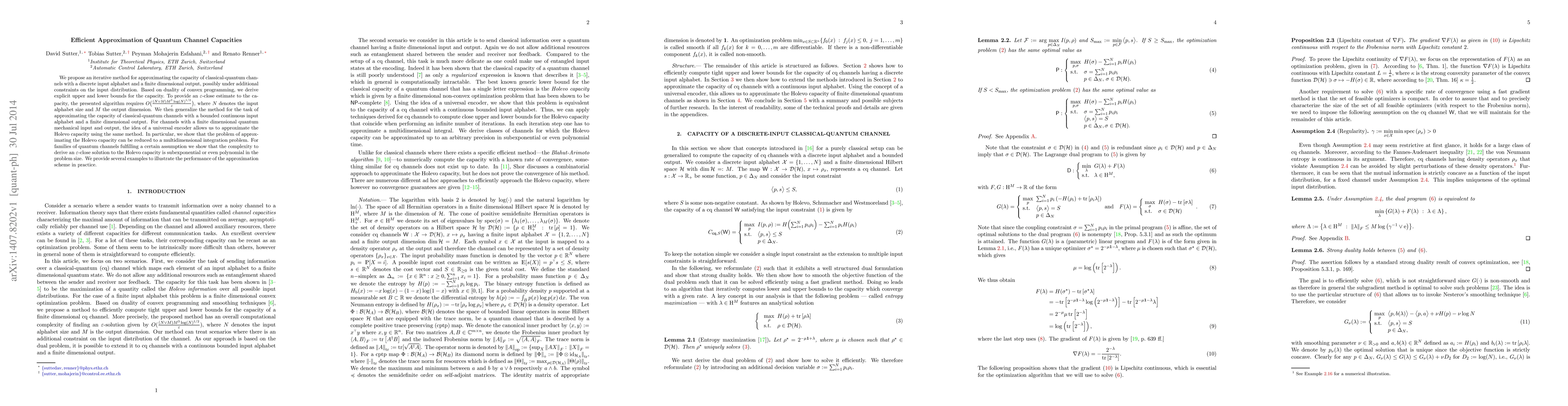 We propose an iterative method for approximating the capacity of classical-quantum channels with a discrete input alphabet and a finite dimensional output, possibly under additional constraints on the input distribution. Based on duality of convex programming, we derive explicit upper and lower bounds for the capacity. To provide an $\varepsilon$-close estimate to the capacity, the presented algorithm requires $O(\tfrac{(N \vee M) M^3 \log(N)^{1/2}}{\varepsilon})$, where $N$ denotes the input alphabet size and $M$ the output dimension. We then generalize the method for the task of approximating the capacity of classical-quantum channels with a bounded continuous input alphabet and a finite dimensional output. For channels with a finite dimensional quantum mechanical input and output, the idea of a universal encoder allows us to approximate the Holevo capacity using the same method. In particular, we show that the problem of approximating the Holevo capacity can be reduced to a multidimensional integration problem. For families of quantum channels fulfilling a certain assumption we show that the complexity to derive an $\varepsilon$-close solution to the Holevo capacity is subexponential or even polynomial in the problem size. We provide several examples to illustrate the performance of the approximation scheme in practice.