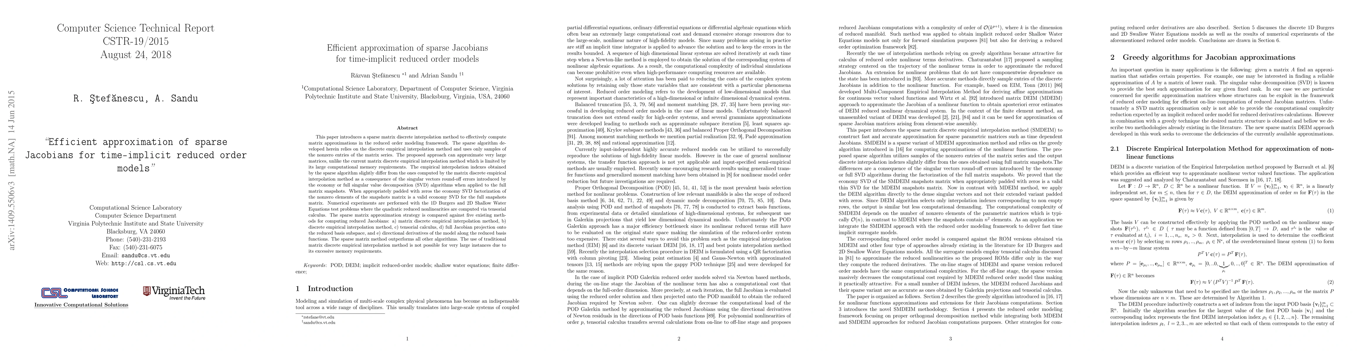 This paper introduces a sparse matrix discrete interpolation method to effectively compute matrix approximations in the reduced order modeling framework. The sparse algorithm developed herein relies on the discrete empirical interpolation method and uses only samples of the nonzero entries of the matrix series. The proposed approach can approximate very large matrices, unlike the current matrix discrete empirical interpolation method which is limited by its large computational memory requirements. The empirical interpolation indexes obtained by the sparse algorithm slightly differ from the ones computed by the matrix discrete empirical interpolation method as a consequence of the singular vectors round-off errors introduced by the economy or full singular value decomposition (SVD) algorithms when applied to the full matrix snapshots. When appropriately padded with zeros the economy SVD factorization of the nonzero elements of the snapshots matrix is a valid economy SVD for the full snapshots matrix. Numerical experiments are performed with the 1D Burgers and 2D Shallow Water Equations test problems where the quadratic reduced nonlinearities are computed via tensorial calculus. The sparse matrix approximation strategy is compared against five existing methods for computing reduced Jacobians: a) matrix discrete empirical interpolation method, b) discrete empirical interpolation method, c) tensorial calculus, d) full Jacobian projection onto the reduced basis subspace, and e) directional derivatives of the model along the reduced basis functions. The sparse matrix method outperforms all other algorithms. The use of traditional matrix discrete empirical interpolation method is not possible for very large instances due to its excessive memory requirements.