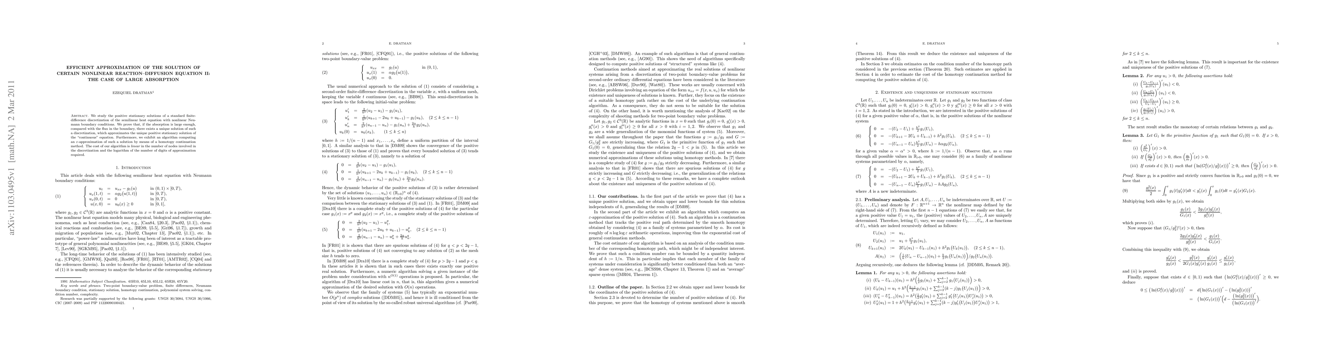 We study the positive stationary solutions of a standard finite-difference discretization of the semilinear heat equation with nonlinear Neumann boundary conditions. We prove that, if the absorption is large enough, compared with the flux in the boundary, there exists a unique solution of such a discretization, which approximates the unique positive stationary solution of the "continuous" equation. Furthermore, we exhibit an algorithm computing an $\epsilon$-approximation of such a solution by means of a homotopy continuation method. The cost of our algorithm is {\em linear} in the number of nodes involved in the discretization and the logarithm of the number of digits of approximation required.