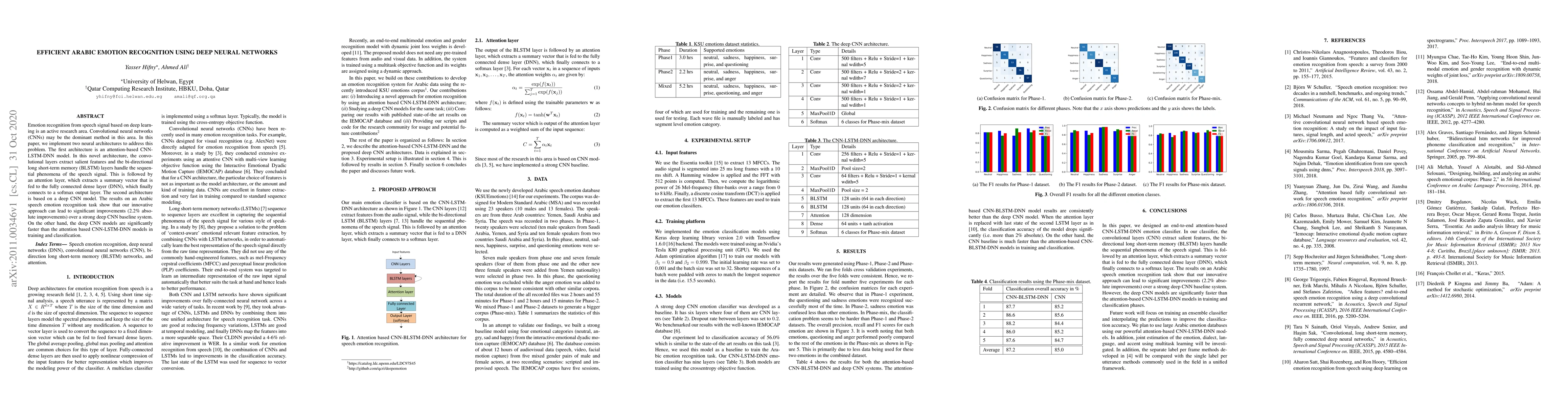 This paper proposes two deep neural network architectures for Arabic emotion recognition from speech: an attention-based CNN-LSTM-DNN model and a deep CNN model. The former achieves a 2.2% improvement over the latter, though the deep CNN model trains and classifies faster.