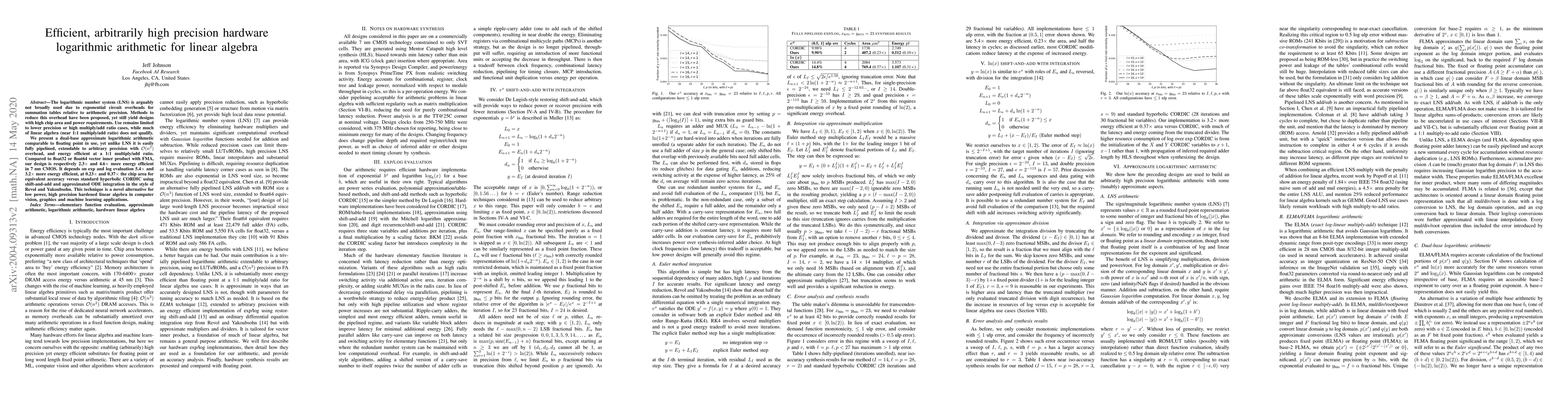 This paper introduces a dual-base logarithmic arithmetic method for linear algebra that achieves high precision and energy efficiency comparable to floating point, while being fully pipelined and extendable to arbitrary precision. It demonstrates significant energy savings over float32/float64 and standard CORDIC methods for applications in computer vision, graphics, and machine learning.
