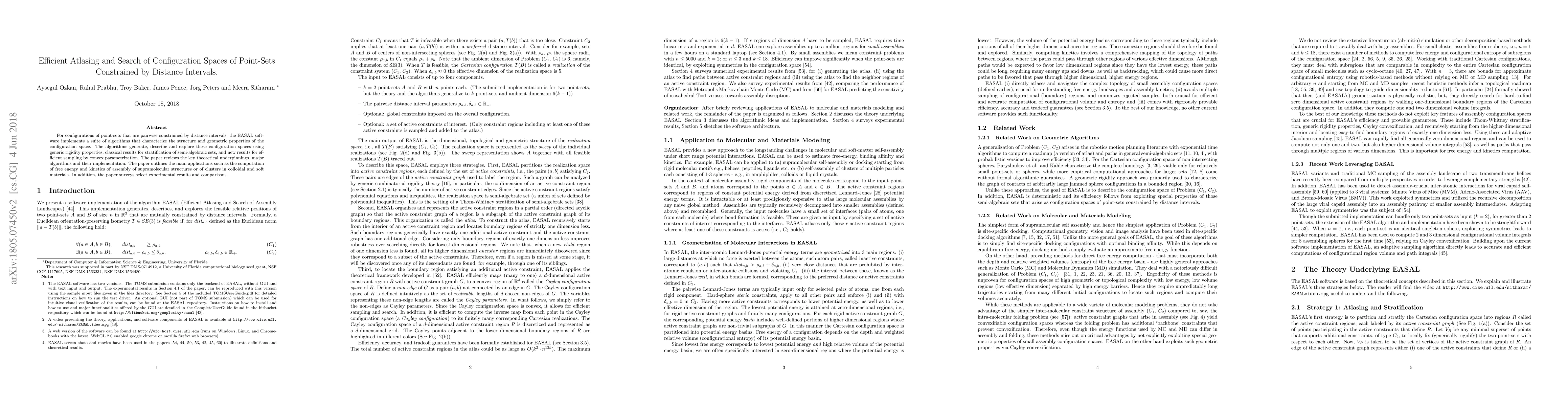 For configurations of point-sets that are pairwise constrained by distance intervals, the EASAL software implements a suite of algorithms that characterize the structure and geometric properties of the configuration space. The algorithms generate, describe and explore these configuration spaces using generic rigidity properties, classical results for stratification of semi-algebraic sets, and new results for efficient sampling by convex parametrization. The paper reviews the key theoretical underpinnings, major algorithms and their implementation. The paper outlines the main applications such as the computation of free energy and kinetics of assembly of supramolecular structures or of clusters in colloidal and soft materials. In addition, the paper surveys select experimental results and comparisons.