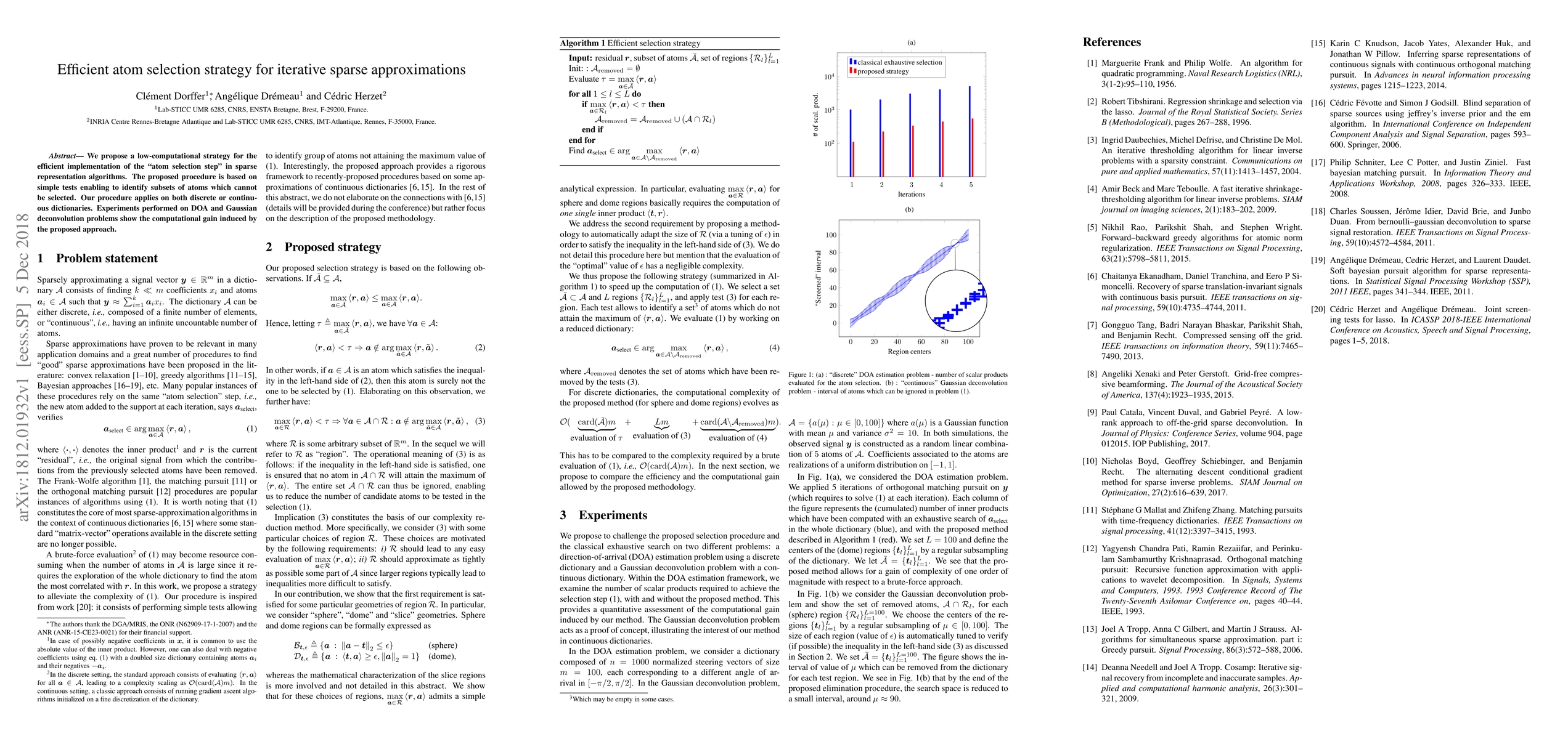 This paper proposes a low-computational strategy to efficiently select atoms in sparse representation algorithms, identifying subsets of atoms that cannot be chosen through simple tests. The method is shown to improve computational efficiency in problems like direction-of-arrival estimation and Gaussian deconvolution.