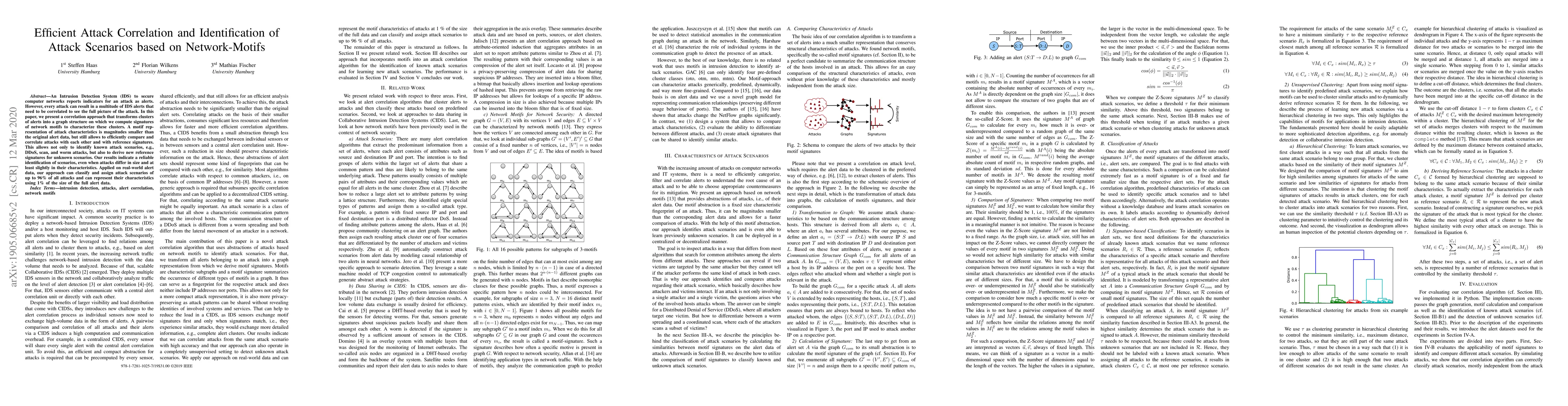 This paper presents a new approach to efficiently correlate and identify attack scenarios in computer networks, using network motifs to characterize clusters of alerts. It can classify up to 96% of attacks and represent their characteristics with just 1% of the original data size.