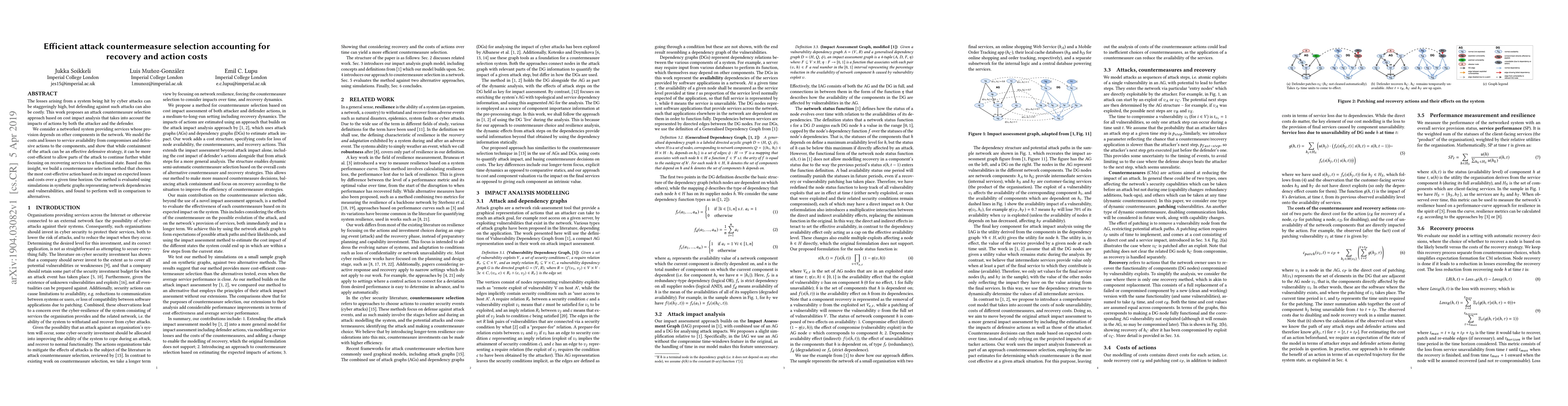 The losses arising from a system being hit by cyber attacks can be staggeringly high, but defending against such attacks can also be costly. This work proposes an attack countermeasure selection approach based on cost impact analysis that takes into account the impacts of actions by both the attacker and the defender. We consider a networked system providing services whose provision depends on other components in the network. We model the costs and losses to service availability from compromises and defensive actions to the components, and show that while containment of the attack can be an effective defensive strategy, it can be more cost-efficient to allow parts of the attack to continue further whilst focusing on recovering services to a functional state. Based on this insight, we build a countermeasure selection method that chooses the most cost-effective action based on its impact on expected losses and costs over a given time horizon. Our method is evaluated using simulations in synthetic graphs representing network dependencies and vulnerabilities, and found to perform well in comparison to alternatives.