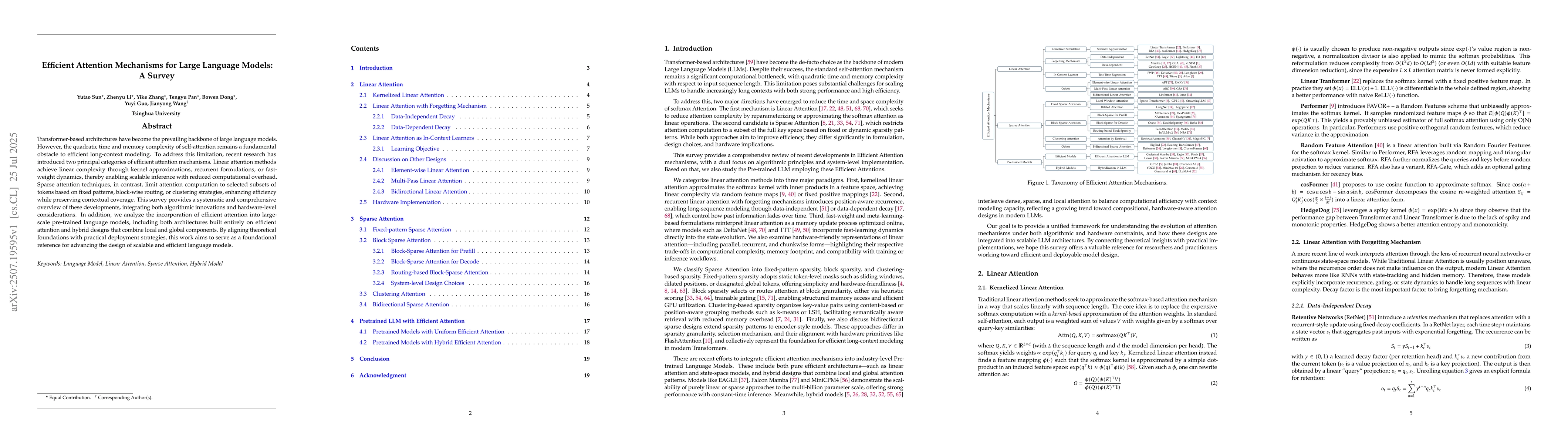 Transformer-based architectures have become the prevailing backbone of large language models. However, the quadratic time and memory complexity of self-attention remains a fundamental obstacle to efficient long-context modeling. To address this limitation, recent research has introduced two principal categories of efficient attention mechanisms. Linear attention methods achieve linear complexity through kernel approximations, recurrent formulations, or fastweight dynamics, thereby enabling scalable inference with reduced computational overhead. Sparse attention techniques, in contrast, limit attention computation to selected subsets of tokens based on fixed patterns, block-wise routing, or clustering strategies, enhancing efficiency while preserving contextual coverage. This survey provides a systematic and comprehensive overview of these developments, integrating both algorithmic innovations and hardware-level considerations. In addition, we analyze the incorporation of efficient attention into largescale pre-trained language models, including both architectures built entirely on efficient attention and hybrid designs that combine local and global components. By aligning theoretical foundations with practical deployment strategies, this work aims to serve as a foundational reference for advancing the design of scalable and efficient language models.