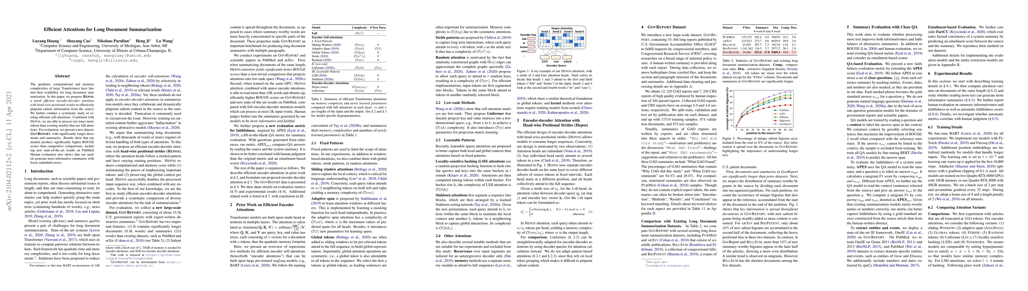 This paper introduces Hepos, an efficient encoder-decoder attention mechanism with head-wise positional strides, to address the scalability issues of large Transformers for long document summarization. The proposed method enables the processing of ten times more tokens compared to full attention models, achieving state-of-the-art results on new and existing datasets.