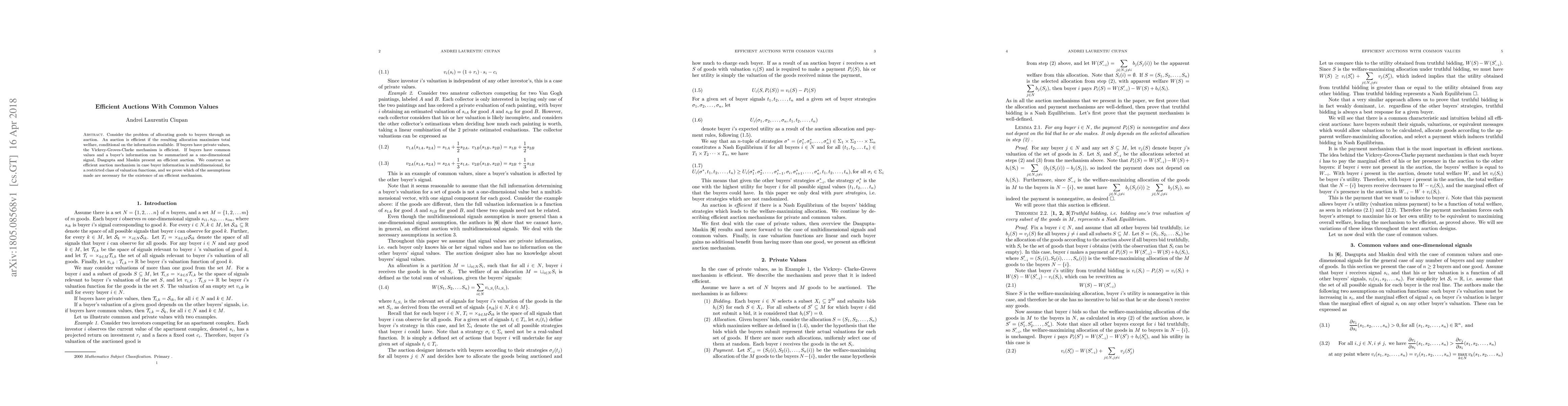 Consider the problem of allocating goods to buyers through an auction. An auction is efficient if the resulting allocation maximizes total welfare, conditional on the information available. If buyers have private values, the Vickrey-Groves-Clarke mechanism is efficient. If buyers have common values and a buyer's information can be summarized as a one-dimensional signal, Dasgupta and Maskin present an efficient auction. We construct an efficient auction mechanism in case buyer information is multidimensional, for a restricted class of valuation functions, and we prove which of the assumptions made are necessary for the existence of an efficient mechanism.