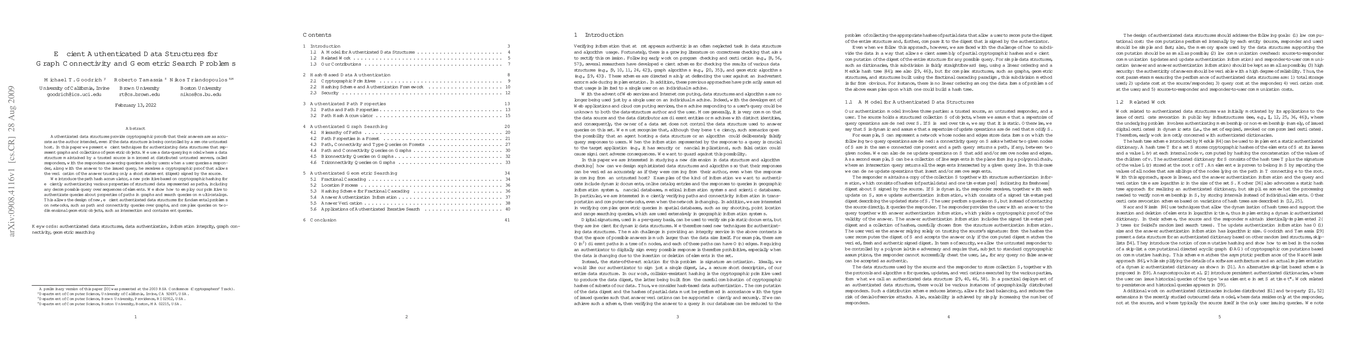 This paper presents efficient authenticated data structures for graph connectivity and geometric search problems, using a new cryptographic primitive called the path hash accumulator to validate properties of paths and queries on structured data. The method enables secure, verifiable solutions for network path and connectivity queries, as well as geometric intersection and containment queries.