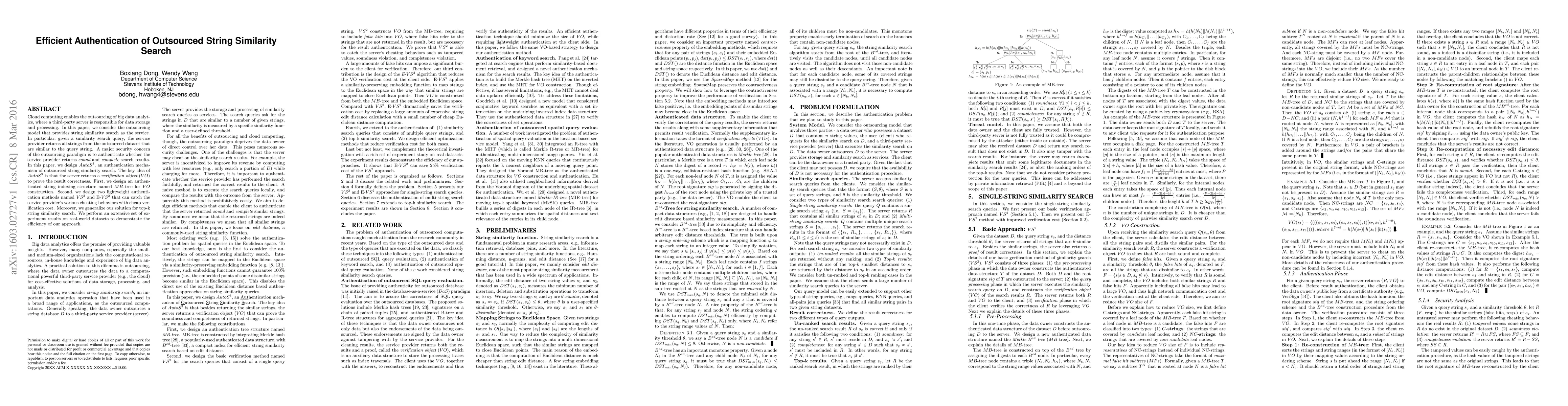 This paper introduces AutoS3, an authentication mechanism for outsourced string similarity search, ensuring that service providers return accurate and complete results. AutoS3 uses an authenticated string indexing structure and lightweight verification methods to verify the search results efficiently.