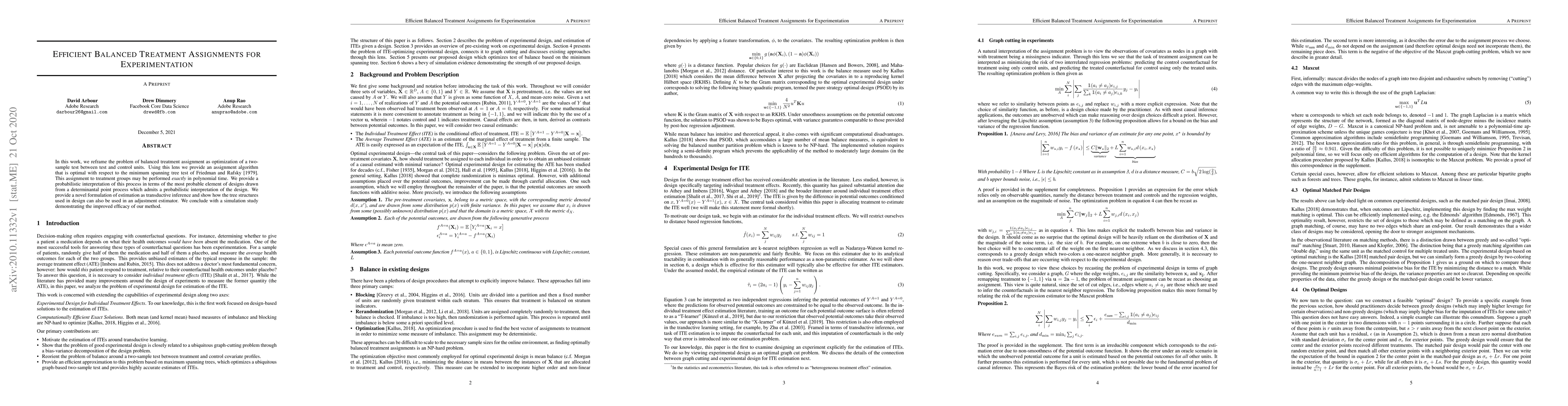 In this work, we reframe the problem of balanced treatment assignment as optimization of a two-sample test between test and control units. Using this lens we provide an assignment algorithm that is optimal with respect to the minimum spanning tree test of Friedman and Rafsky (1979). This assignment to treatment groups may be performed exactly in polynomial time. We provide a probabilistic interpretation of this process in terms of the most probable element of designs drawn from a determinantal point process which admits a probabilistic interpretation of the design. We provide a novel formulation of estimation as transductive inference and show how the tree structures used in design can also be used in an adjustment estimator. We conclude with a simulation study demonstrating the improved efficacy of our method.