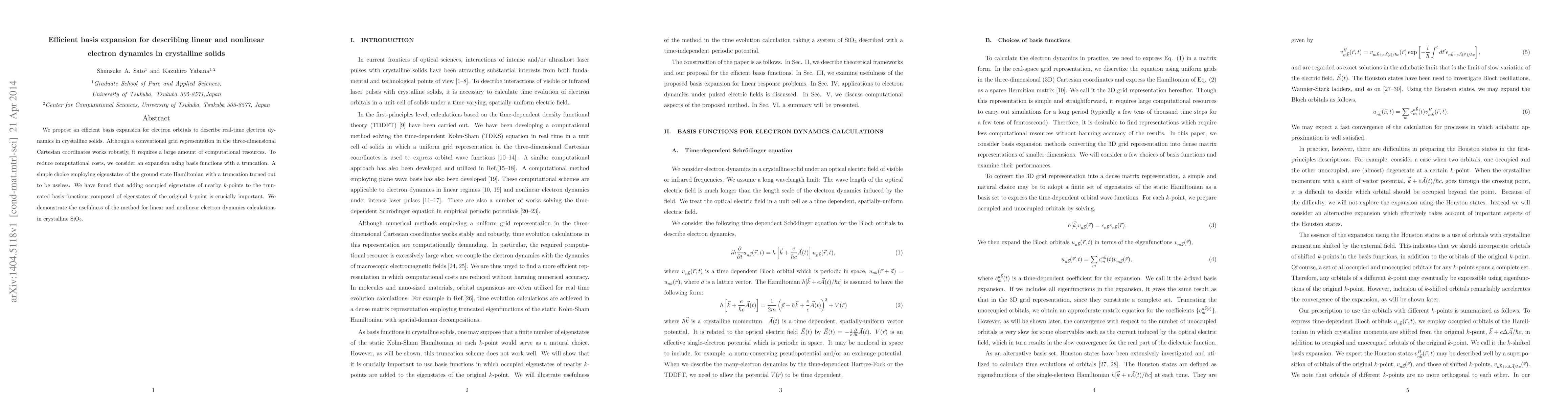 This paper proposes an efficient basis expansion method using eigenstates of nearby $k$-points to describe real-time electron dynamics in crystalline solids, significantly reducing computational costs compared to conventional grid methods. The method is demonstrated to be effective for both linear and nonlinear dynamics in crystalline SiO$_2$.