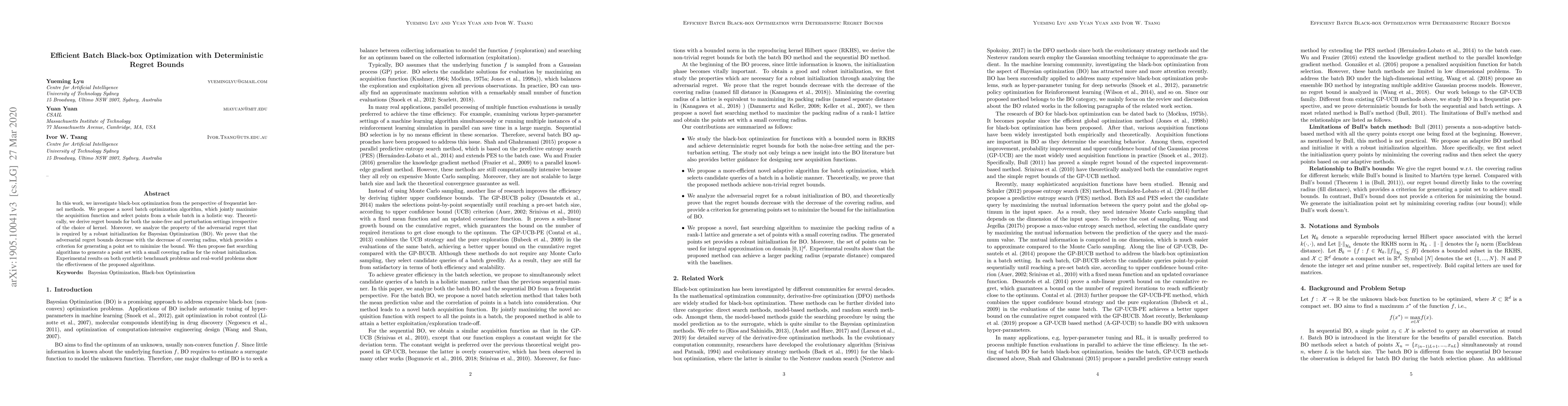 In this work, we investigate black-box optimization from the perspective of frequentist kernel methods. We propose a novel batch optimization algorithm, which jointly maximizes the acquisition function and select points from a whole batch in a holistic way. Theoretically, we derive regret bounds for both the noise-free and perturbation settings irrespective of the choice of kernel. Moreover, we analyze the property of the adversarial regret that is required by a robust initialization for Bayesian Optimization (BO). We prove that the adversarial regret bounds decrease with the decrease of covering radius, which provides a criterion for generating a point set to minimize the bound. We then propose fast searching algorithms to generate a point set with a small covering radius for the robust initialization. Experimental results on both synthetic benchmark problems and real-world problems show the effectiveness of the proposed algorithms.