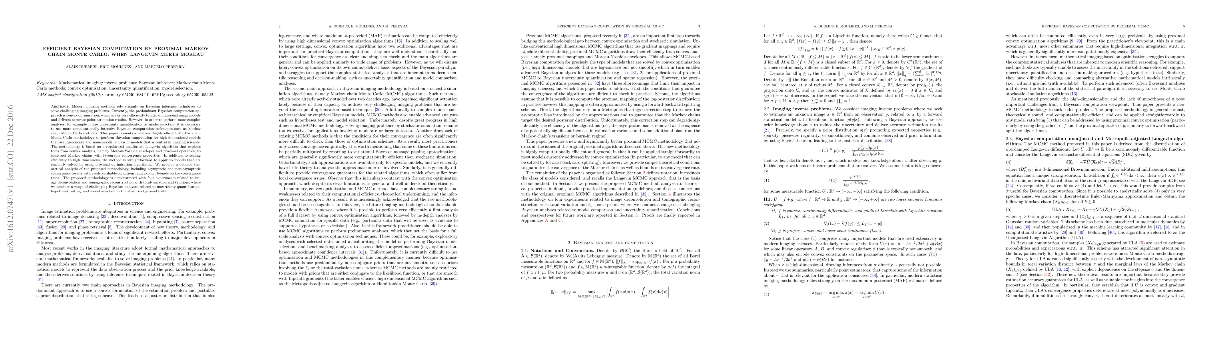 This paper introduces an efficient Markov chain Monte Carlo method for Bayesian computation in high-dimensional, log-concave, and non-smooth models, leveraging a regularised unadjusted Langevin algorithm enhanced by Moreau-Yoshida envelopes and proximal operators. The method scales well to large dimensions and is demonstrated through experiments on image deconvolution and tomographic reconstruction.