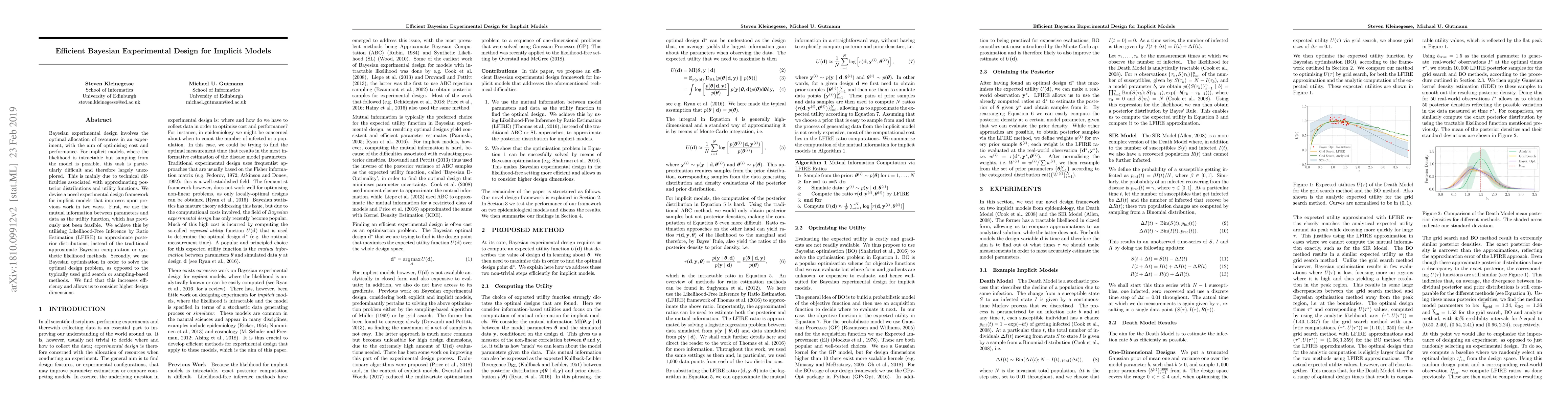 This paper introduces a novel Bayesian experimental design framework for implicit models, employing Likelihood-Free Inference by Ratio Estimation (LFIRE) to approximate posterior distributions. It uses mutual information as the utility function and Bayesian optimisation to enhance efficiency and accommodate higher design dimensions.