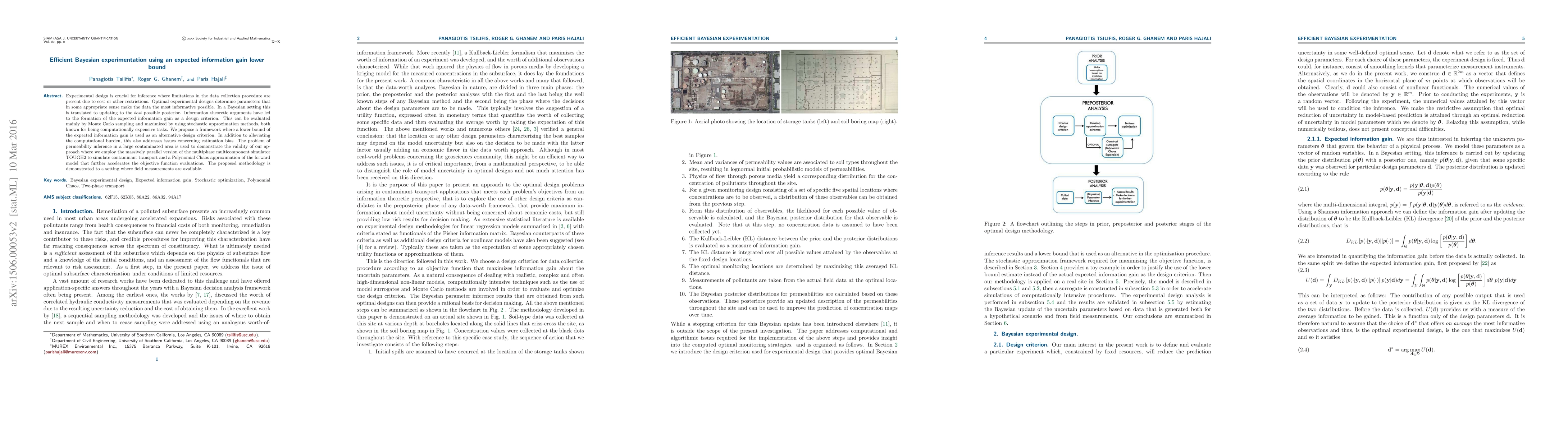 Experimental design is crucial for inference where limitations in the data collection procedure are present due to cost or other restrictions. Optimal experimental designs determine parameters that in some appropriate sense make the data the most informative possible. In a Bayesian setting this is translated to updating to the best possible posterior. Information theoretic arguments have led to the formation of the expected information gain as a design criterion. This can be evaluated mainly by Monte Carlo sampling and maximized by using stochastic approximation methods, both known for being computationally expensive tasks. We propose a framework where a lower bound of the expected information gain is used as an alternative design criterion. In addition to alleviating the computational burden, this also addresses issues concerning estimation bias. The problem of permeability inference in a large contaminated area is used to demonstrate the validity of our approach where we employ the massively parallel version of the multiphase multicomponent simulator TOUGH2 to simulate contaminant transport and a Polynomial Chaos approximation of the forward model that further accelerates the objective function evaluations. The proposed methodology is demonstrated to a setting where field measurements are available.