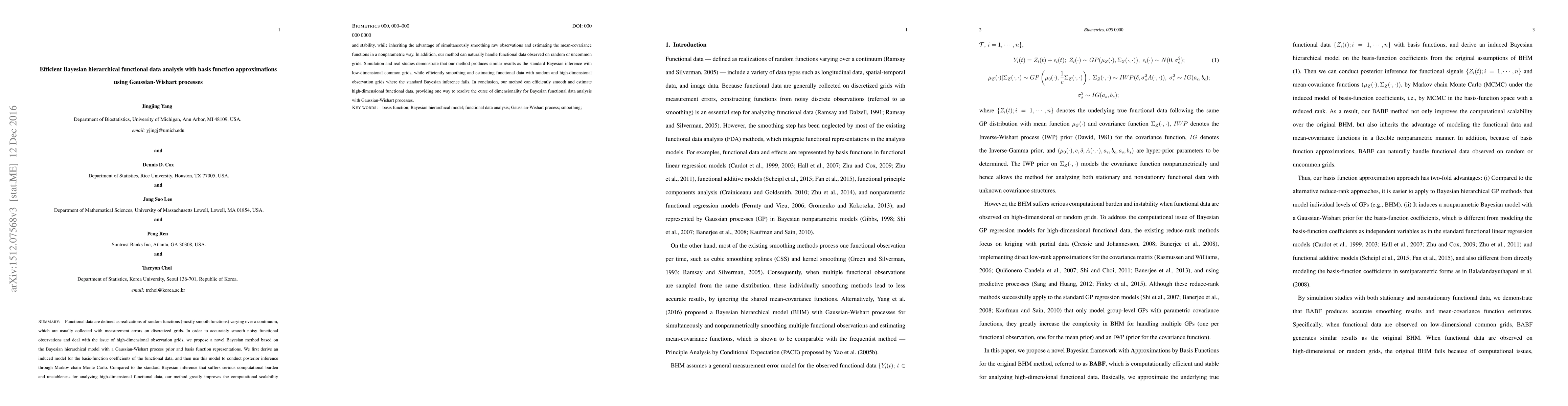 This paper proposes a novel Bayesian hierarchical method for functional data analysis using Gaussian-Wishart processes and basis function approximations to efficiently smooth noisy and high-dimensional functional observations. The method improves computational scalability and stability compared to standard Bayesian inference, effectively handling data on random or uncommon grids.