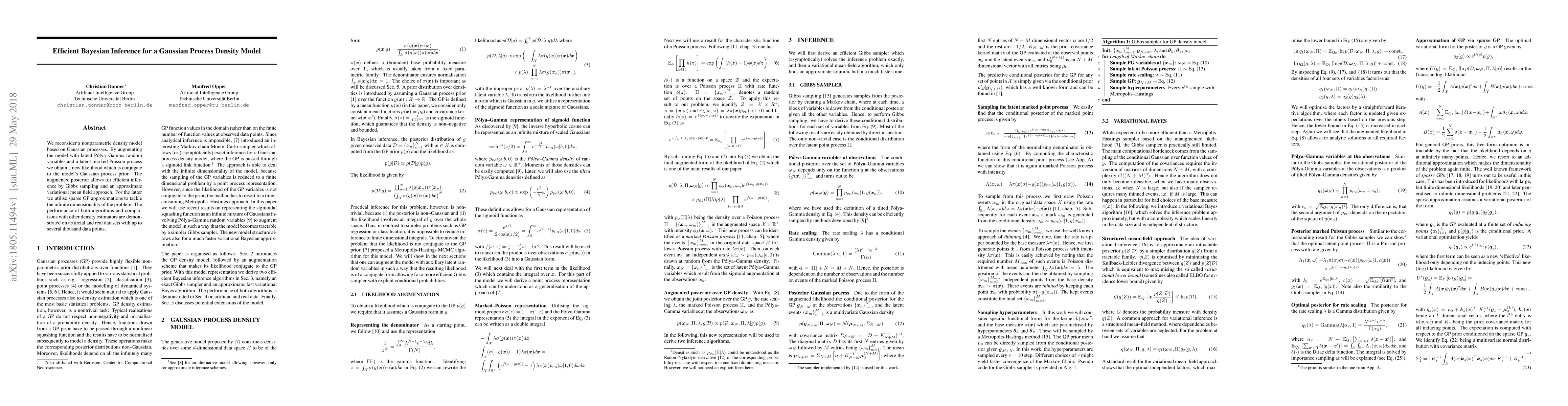 We reconsider a nonparametric density model based on Gaussian processes. By augmenting the model with latent P\'olya--Gamma random variables and a latent marked Poisson process we obtain a new likelihood which is conjugate to the model's Gaussian process prior. The augmented posterior allows for efficient inference by Gibbs sampling and an approximate variational mean field approach. For the latter we utilise sparse GP approximations to tackle the infinite dimensionality of the problem. The performance of both algorithms and comparisons with other density estimators are demonstrated on artificial and real datasets with up to several thousand data points.