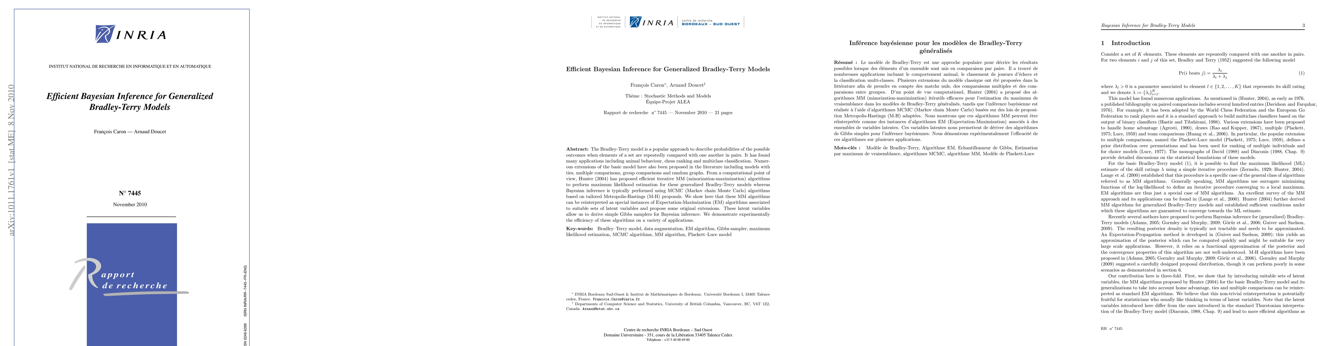 This paper proposes efficient Bayesian inference methods for generalized Bradley-Terry models using reinterpreted MM algorithms as EM algorithms with latent variables, leading to simple Gibbs samplers. Experimental results show the effectiveness of these methods across various applications.