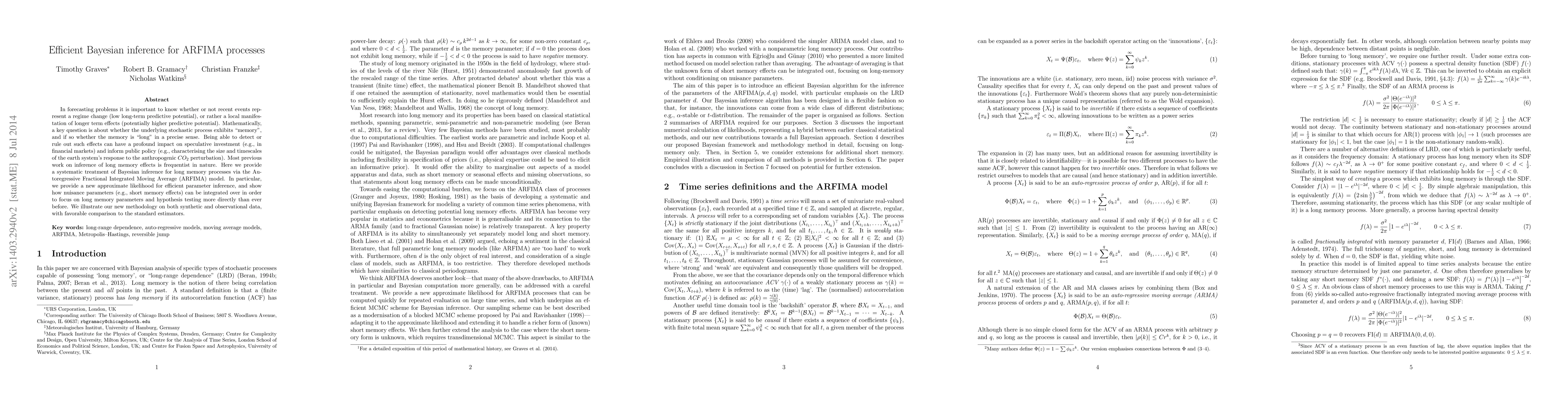 In forecasting problems it is important to know whether or not recent events represent a regime change (low long-term predictive potential), or rather a local manifestation of longer term effects (potentially higher predictive potential). Mathematically, a key question is about whether the underlying stochastic process exhibits "memory", and if so whether the memory is "long" in a precise sense. Being able to detect or rule out such effects can have a profound impact on speculative investment (e.g., in financial markets) and inform public policy (e.g., characterising the size and timescales of the earth system's response to the anthropogenic CO2 perturbation). Most previous work on inference of long memory effects is frequentist in nature. Here we provide a systematic treatment of Bayesian inference for long memory processes via the Autoregressive Fractional Integrated Moving Average (ARFIMA) model. In particular, we provide a new approximate likelihood for efficient parameter inference, and show how nuisance parameters (e.g., short memory effects) can be integrated over in order to focus on long memory parameters and hypothesis testing more directly than ever before. We illustrate our new methodology on both synthetic and observational data, with favorable comparison to the standard estimators.