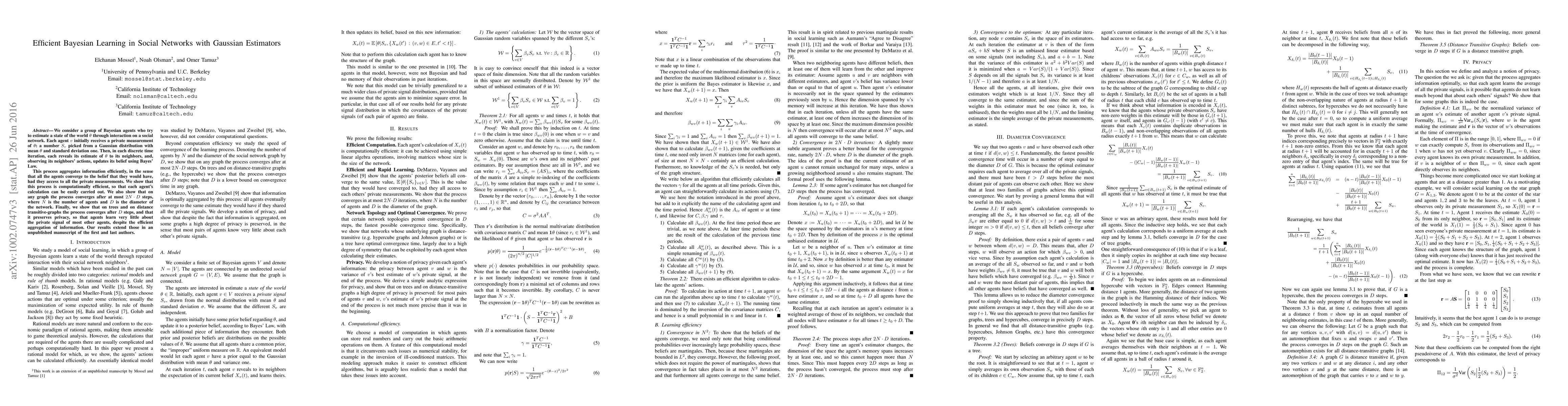 We consider a group of Bayesian agents who try to estimate a state of the world $\theta$ through interaction on a social network. Each agent $v$ initially receives a private measurement of $\theta$: a number $S_v$ picked from a Gaussian distribution with mean $\theta$ and standard deviation one. Then, in each discrete time iteration, each reveals its estimate of $\theta$ to its neighbors, and, observing its neighbors' actions, updates its belief using Bayes' Law. This process aggregates information efficiently, in the sense that all the agents converge to the belief that they would have, had they access to all the private measurements. We show that this process is computationally efficient, so that each agent's calculation can be easily carried out. We also show that on any graph the process converges after at most $2N \cdot D$ steps, where $N$ is the number of agents and $D$ is the diameter of the network. Finally, we show that on trees and on distance transitive-graphs the process converges after $D$ steps, and that it preserves privacy, so that agents learn very little about the private signal of most other agents, despite the efficient aggregation of information. Our results extend those in an unpublished manuscript of the first and last authors.