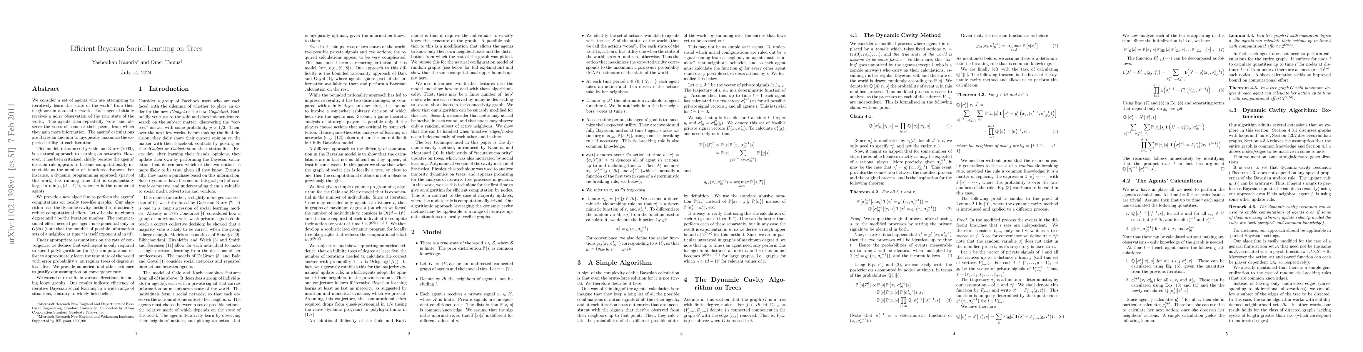 We consider a set of agents who are attempting to iteratively learn the 'state of the world' from their neighbors in a social network. Each agent initially receives a noisy observation of the true state of the world. The agents then repeatedly 'vote' and observe the votes of some of their peers, from which they gain more information. The agents' calculations are Bayesian and aim to myopically maximize the expected utility at each iteration. This model, introduced by Gale and Kariv (2003), is a natural approach to learning on networks. However, it has been criticized, chiefly because the agents' decision rule appears to become computationally intractable as the number of iterations advances. For instance, a dynamic programming approach (part of this work) has running time that is exponentially large in \min(n, (d-1)^t), where n is the number of agents. We provide a new algorithm to perform the agents' computations on locally tree-like graphs. Our algorithm uses the dynamic cavity method to drastically reduce computational effort. Let d be the maximum degree and t be the iteration number. The computational effort needed per agent is exponential only in O(td) (note that the number of possible information sets of a neighbor at time t is itself exponential in td). Under appropriate assumptions on the rate of convergence, we deduce that each agent is only required to spend polylogarithmic (in 1/\eps) computational effort to approximately learn the true state of the world with error probability \eps, on regular trees of degree at least five. We provide numerical and other evidence to justify our assumption on convergence rate. We extend our results in various directions, including loopy graphs. Our results indicate efficiency of iterative Bayesian social learning in a wide range of situations, contrary to widely held beliefs.