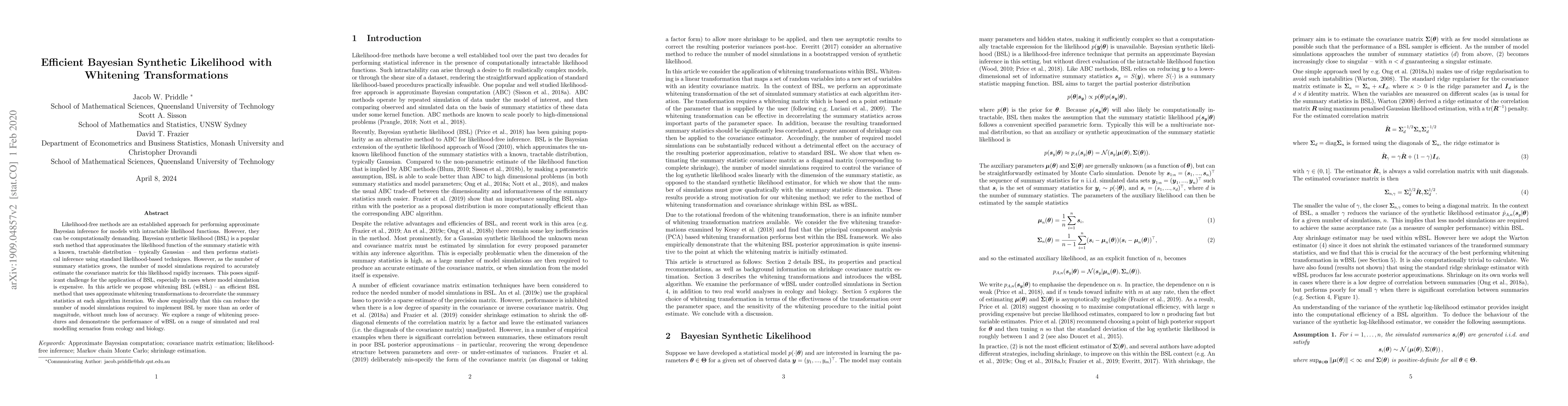 This paper proposes whitening Bayesian synthetic likelihood (wBSL) to efficiently perform approximate Bayesian inference for models with intractable likelihoods. By using whitening transformations to decorrelate summary statistics, the method significantly reduces the number of costly model simulations required, achieving substantial computational gains with minimal loss of accuracy.