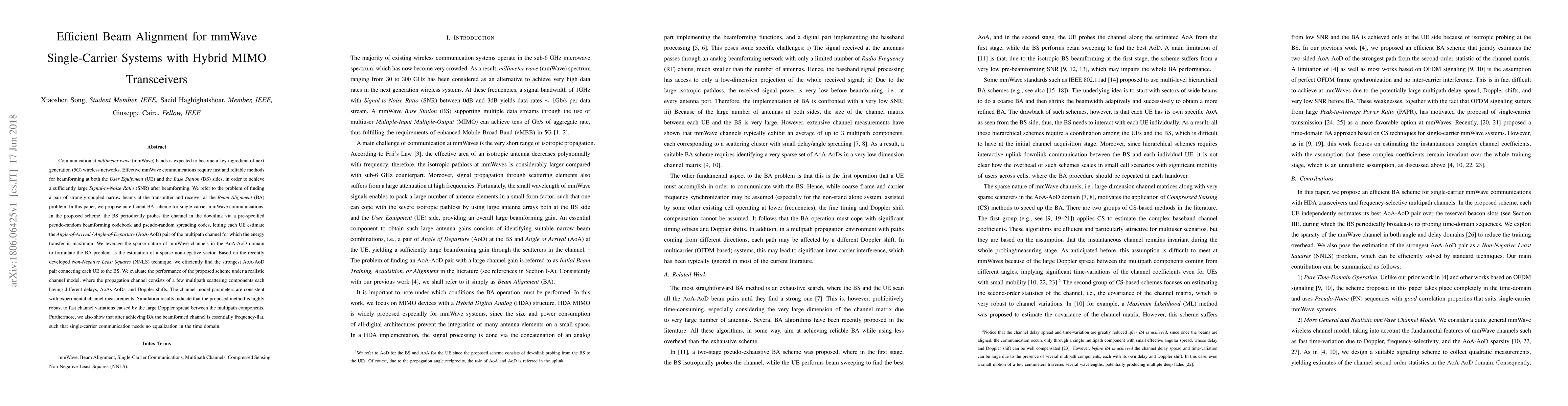 Researchers propose an efficient beam alignment method for mmWave single-carrier systems that leverages sparse channel characteristics to estimate the strongest Angle-of-Arrival/Angle-of-Departure pairs between users and base stations, achieving robust performance against fast channel variations.