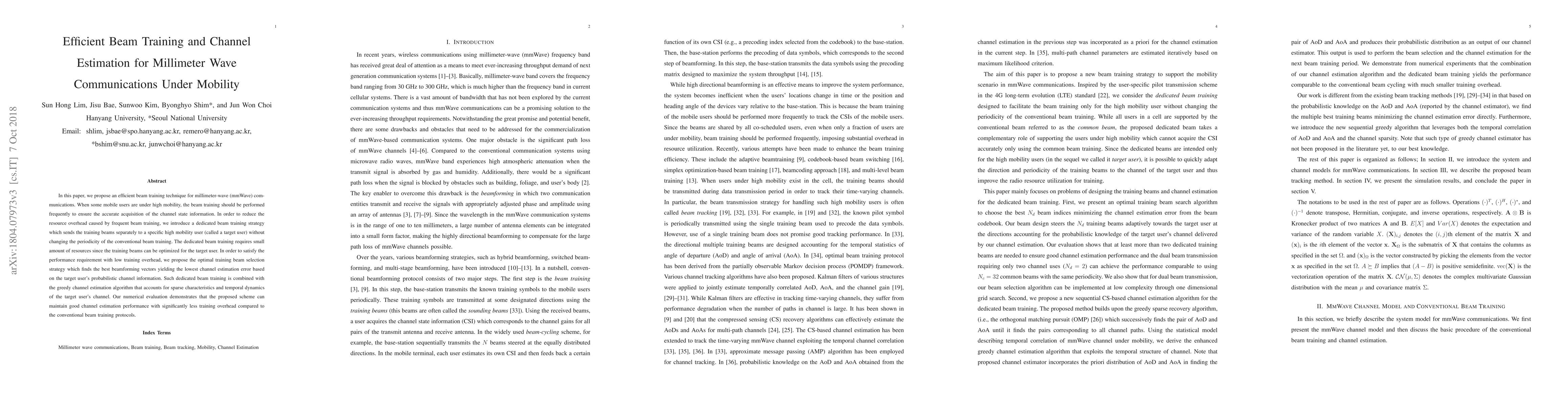 This paper proposes an efficient beam training technique for millimeter-wave communications under high mobility, introducing a dedicated strategy to minimize resource overhead. The method combines optimal training beam selection with a greedy channel estimation algorithm to achieve accurate channel state information with reduced training overhead.